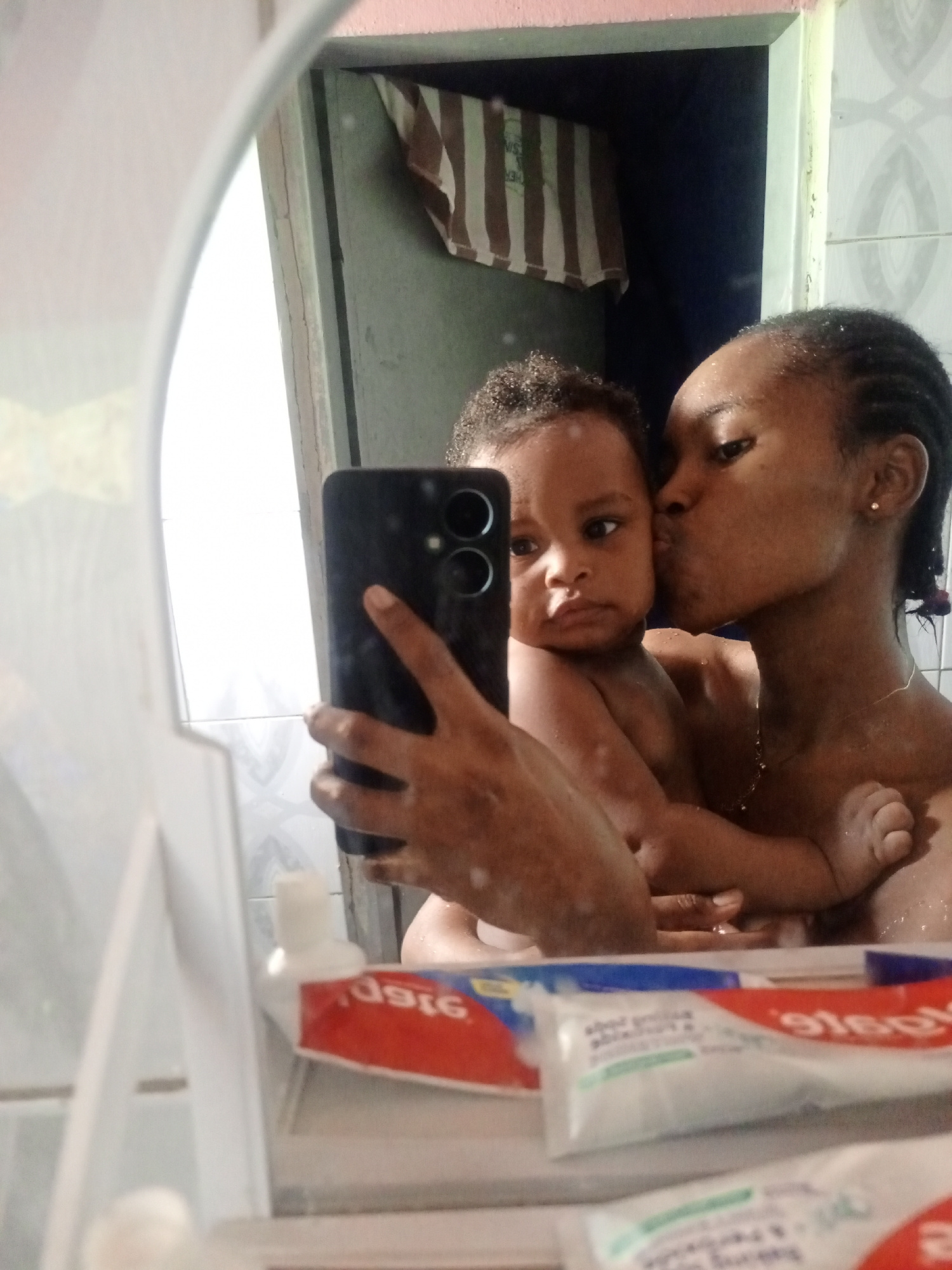 A woman, holding a baby, is taking a selfie in a bathroom mirror. The woman is kissing the baby on the cheek. Tubes of toothpaste are visible on a shelf below the mirror. The location is believed to b…read more