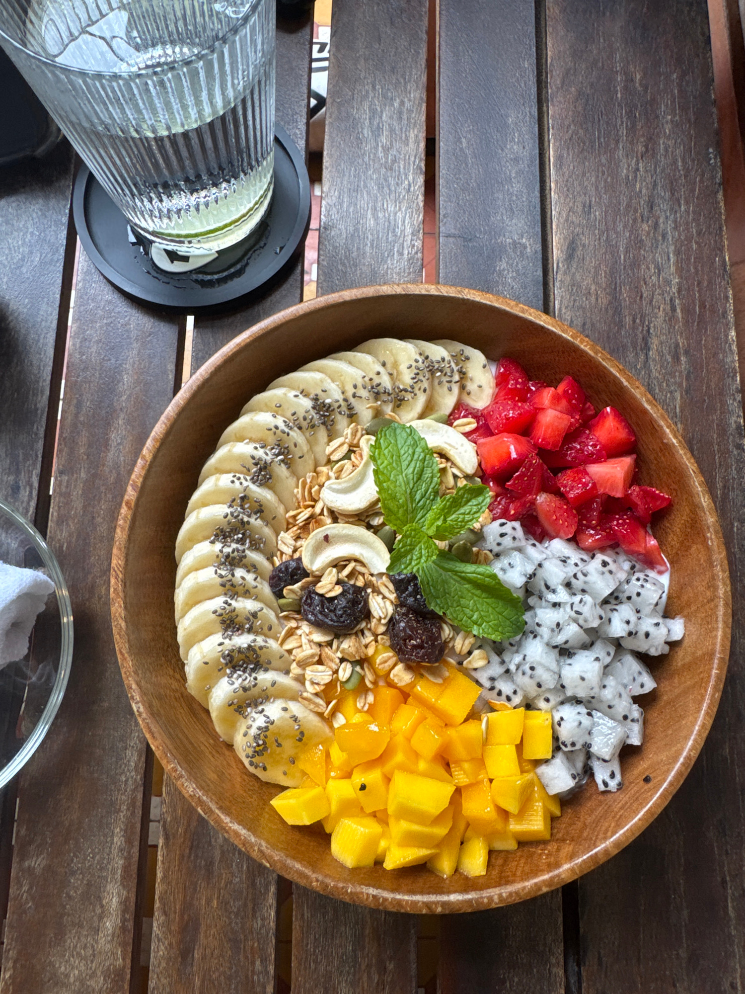 A wooden bowl containing a fruit and granola bowl is centered on a dark wooden table with horizontal slats. The bowl contains sections of diced strawberries, dragon fruit, mango, and sliced bananas wi…read more