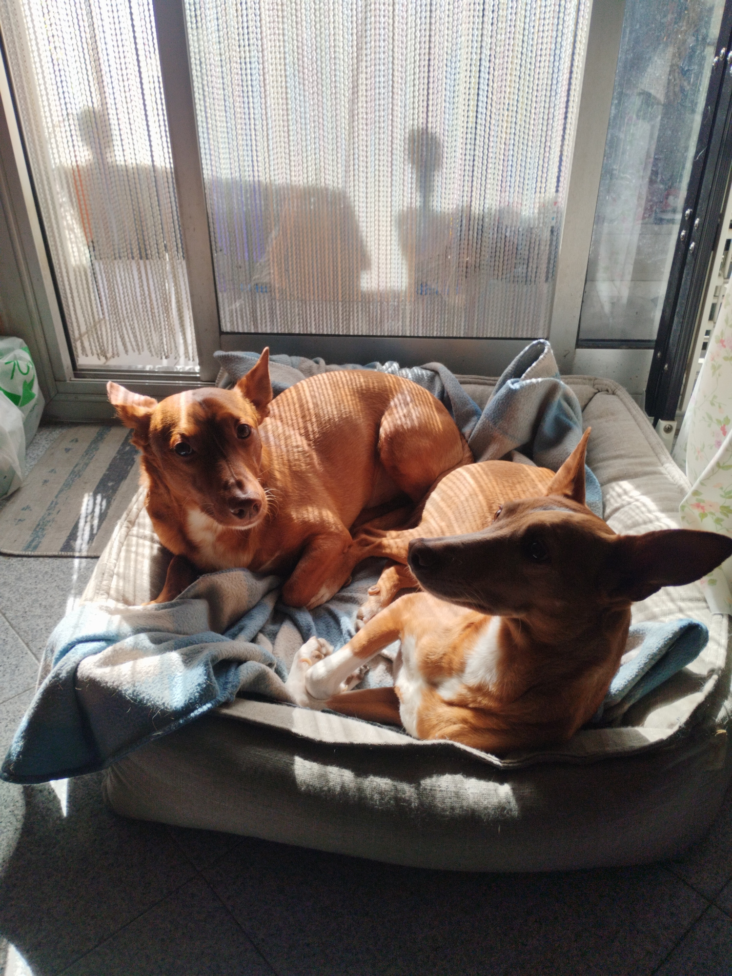 Two tan dogs with white markings are resting in a gray dog bed covered with a blue and white patterned blanket. The bed is located near a window with a beaded curtain, through which indistinct silhoue…read more