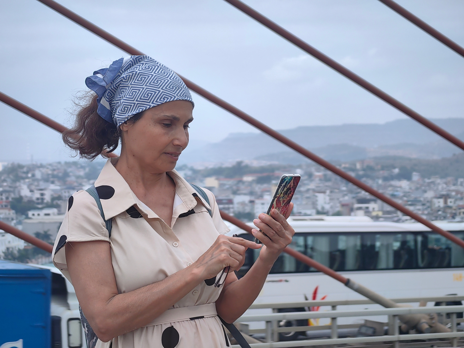 A woman is captured in a medium shot, standing outdoors and intently engaged with her smartphone. She is positioned slightly to the left of the frame, facing towards the right with her head tilted dow…read more