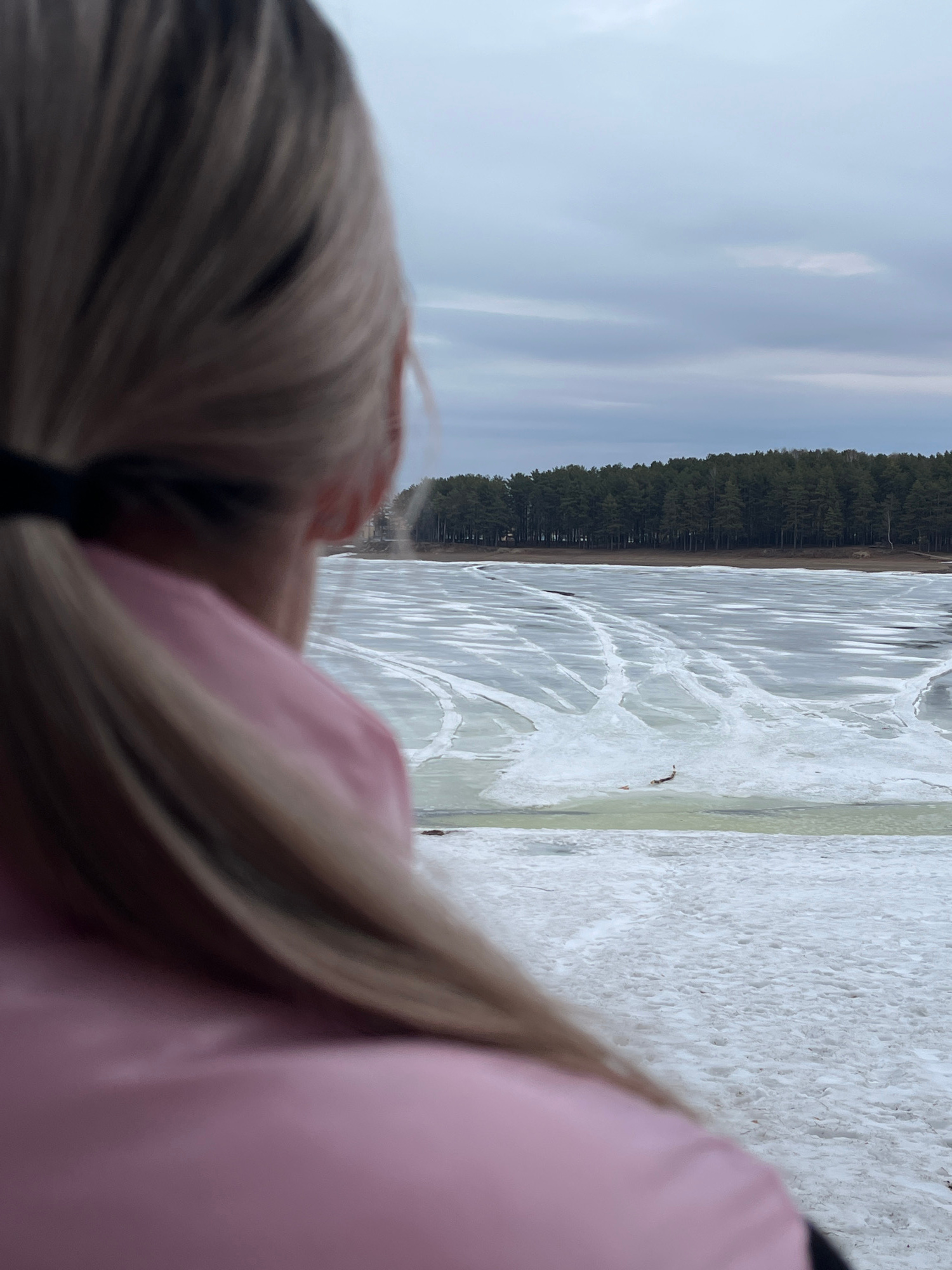 The image shows a person with long, blonde hair and a pink garment standing near a body of water. The water is partially covered in ice, with a snow-covered shoreline. In the background, a dense fores…read more