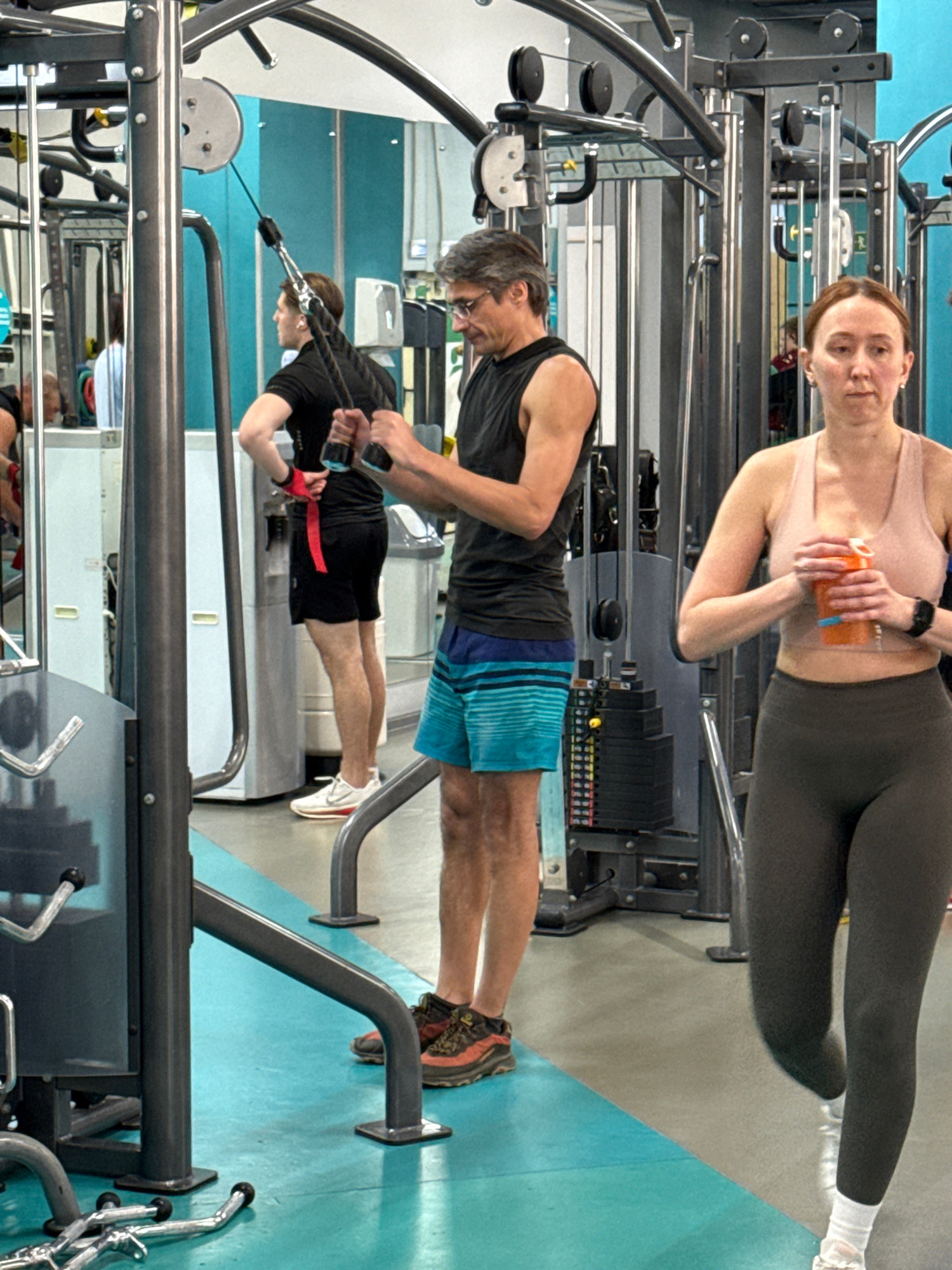 The image depicts an indoor gym scene, likely situated in Yekaterinburg, Russia, featuring three individuals engaged in or pausing from physical activity during what appears to be daytime. On the lef…read more