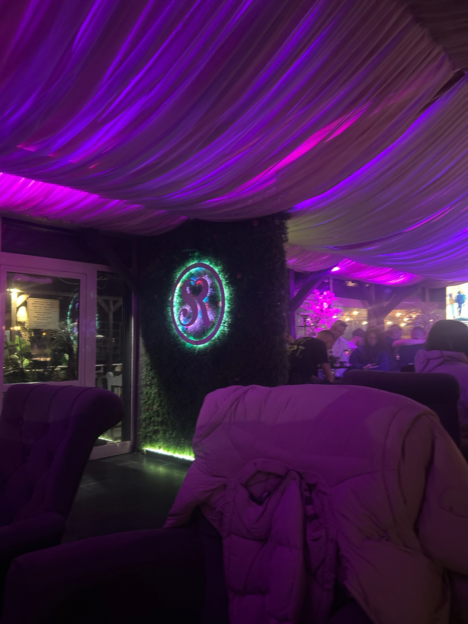 Indoor scene. A white tent-like canopy draped with purple lighting is seen to the left. In the center is a green wall with a circular logo, which is illuminated with green and red lights. Below that…read more