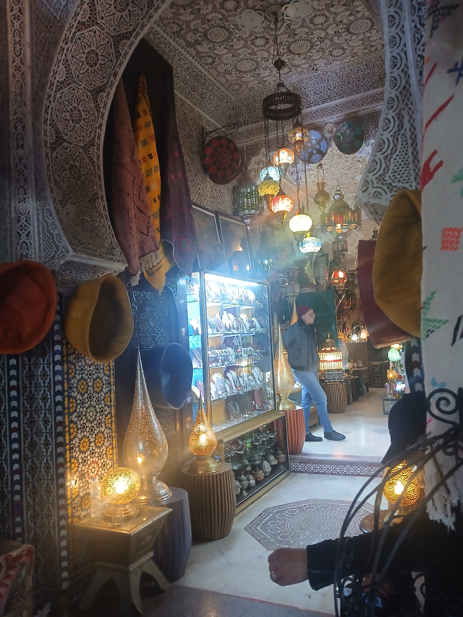 This photograph depicts the interior of a shop in Meknes, Morocco. The space is filled with lamps and traditional Moroccan items. A man in casual clothing appears to be inside the store, likely as a c…read more