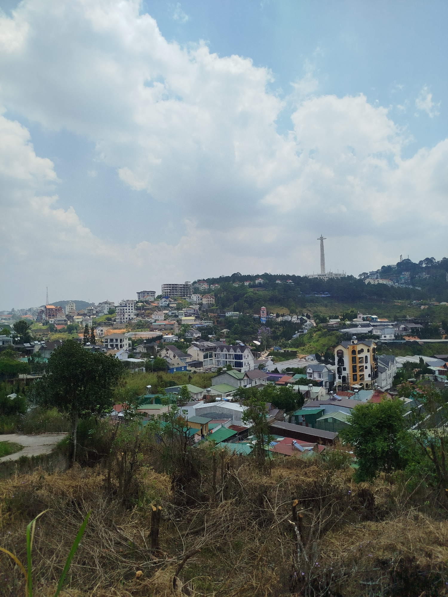 The image shows a cityscape in Da Lat, Vietnam, taken from an elevated viewpoint. The foreground is dominated by dry, overgrown vegetation. Beyond this lies a dense arrangement of houses and buildings…read more