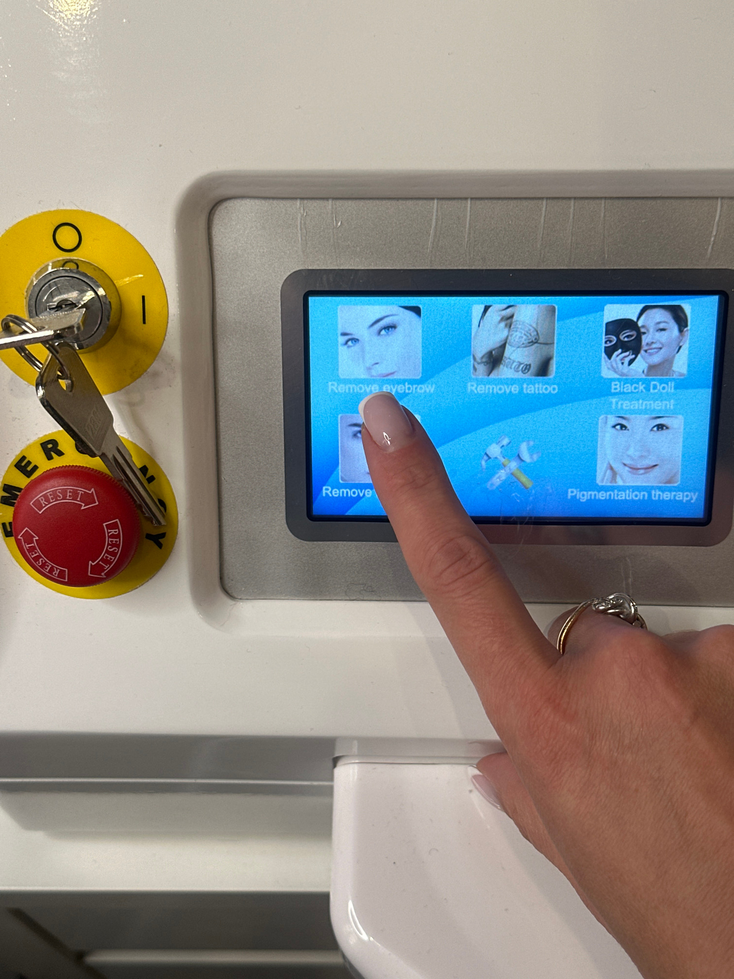 A close-up photograph shows a person's hand touching the screen of a machine, possibly a cosmetic or medical device. The screen displays several options with images and text, including "Black Doll Tre…read more