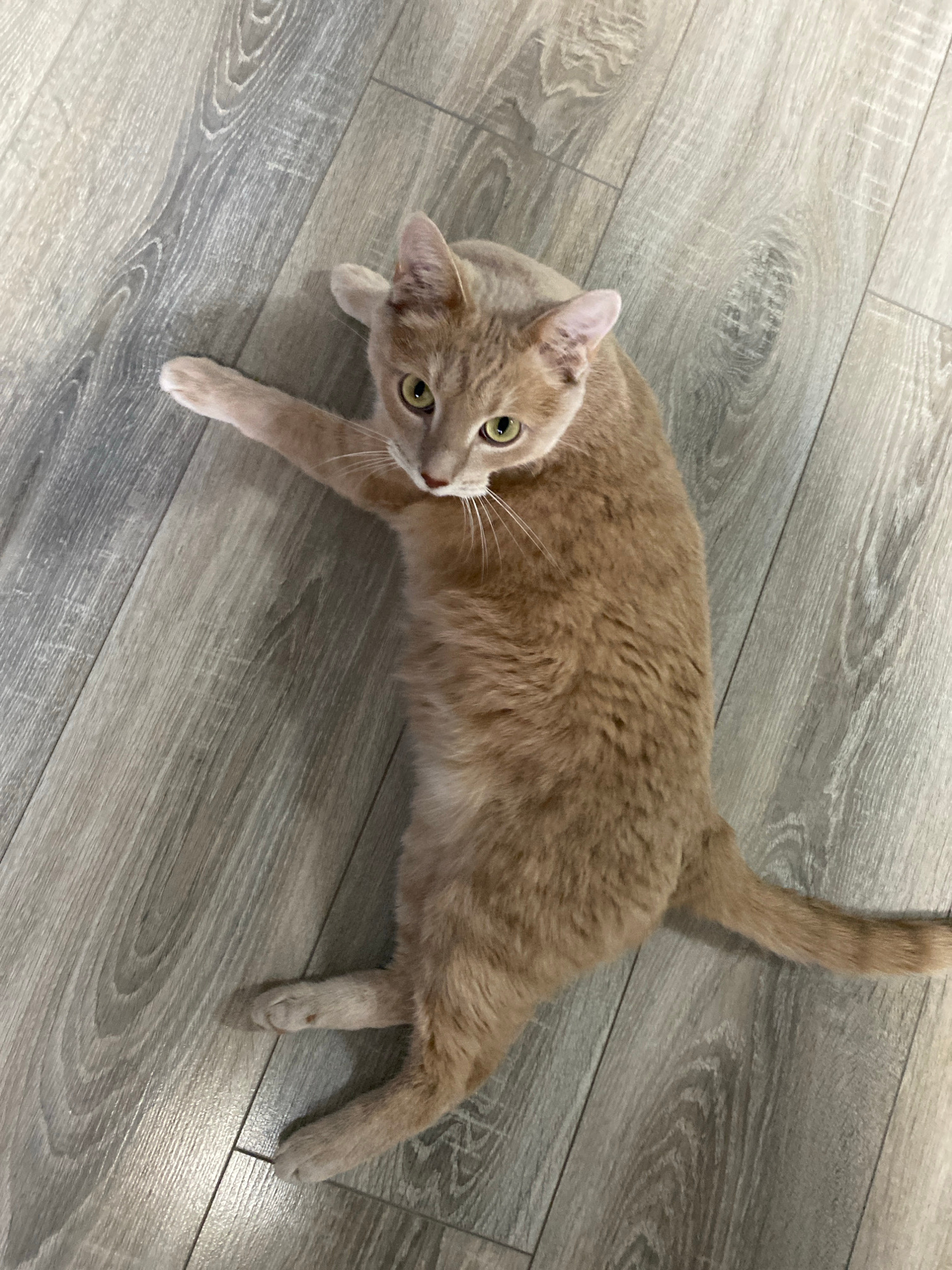 A light orange, cream, and buff-colored cat lies stretched out on a light grey laminate wood floor, looking upwards and to its left. The cat has distinct green/hazel eyes and long white whiskers. Fain…read more