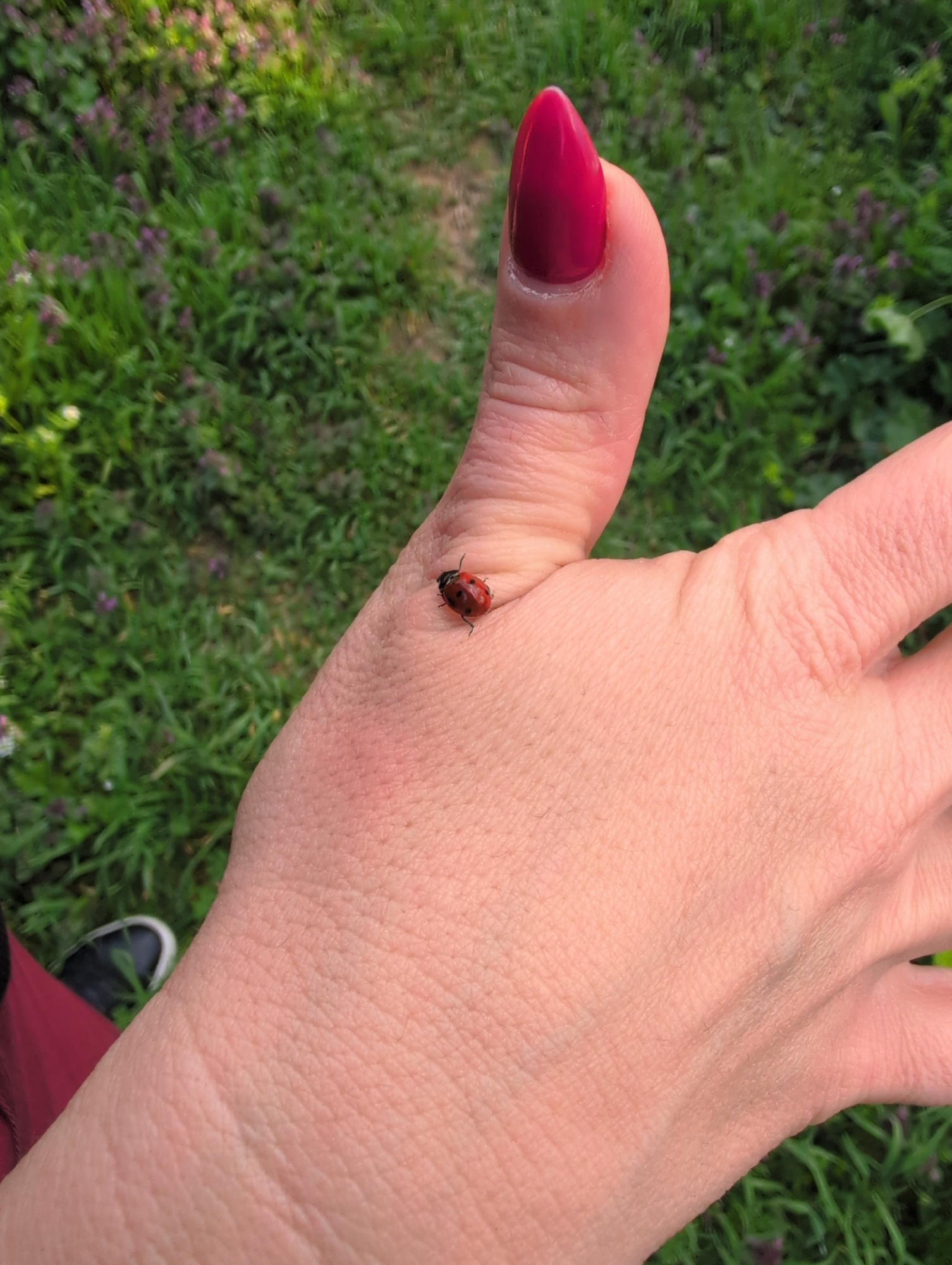 The image shows a close-up of a person's hand with a ladybug on the thumb. The thumb has a red polished fingernail. The background consists of green grass and some small purple flowers. A glimpse of a…read more
