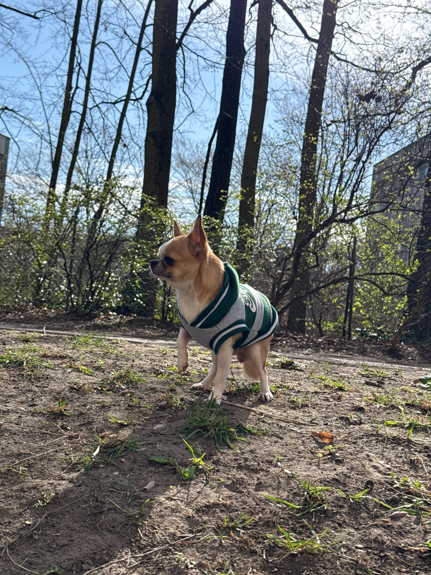 A light brown and white Chihuahua, wearing a grey and green striped sweater, stands in profile facing left on a patch of uneven soil sparsely covered with green grass, dry leaves, and twigs. Its leftβ¦read more