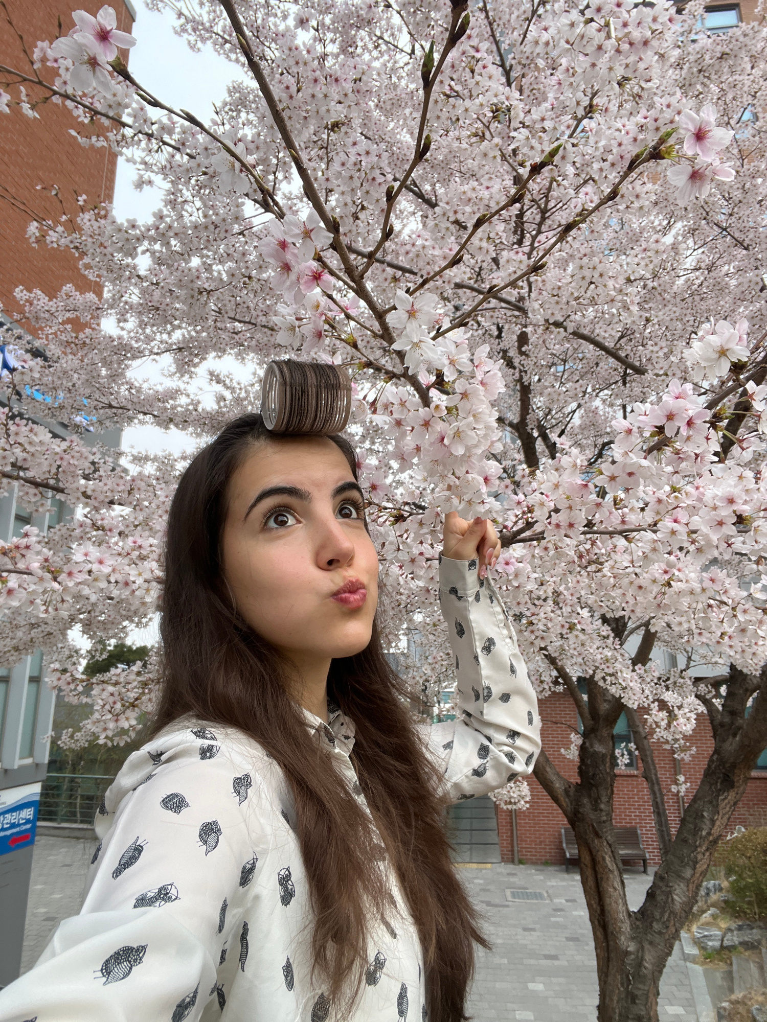 A young woman poses for a selfie outdoors in Daegu, South Korea. A cylindrical object, possibly a stack of coasters, balances on her head. She is wearing a white blouse with black owl patterns. Behind…read more