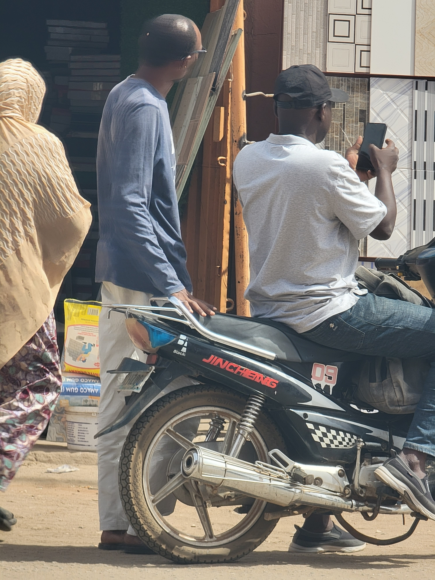 A man wearing a gray shirt, blue jeans, and sneakers sits on a black motorcycle on a city street in Maiburiji, Nigeria. He holds a phone in his hand. Another man wearing a blue shirt, white pants, and…read more