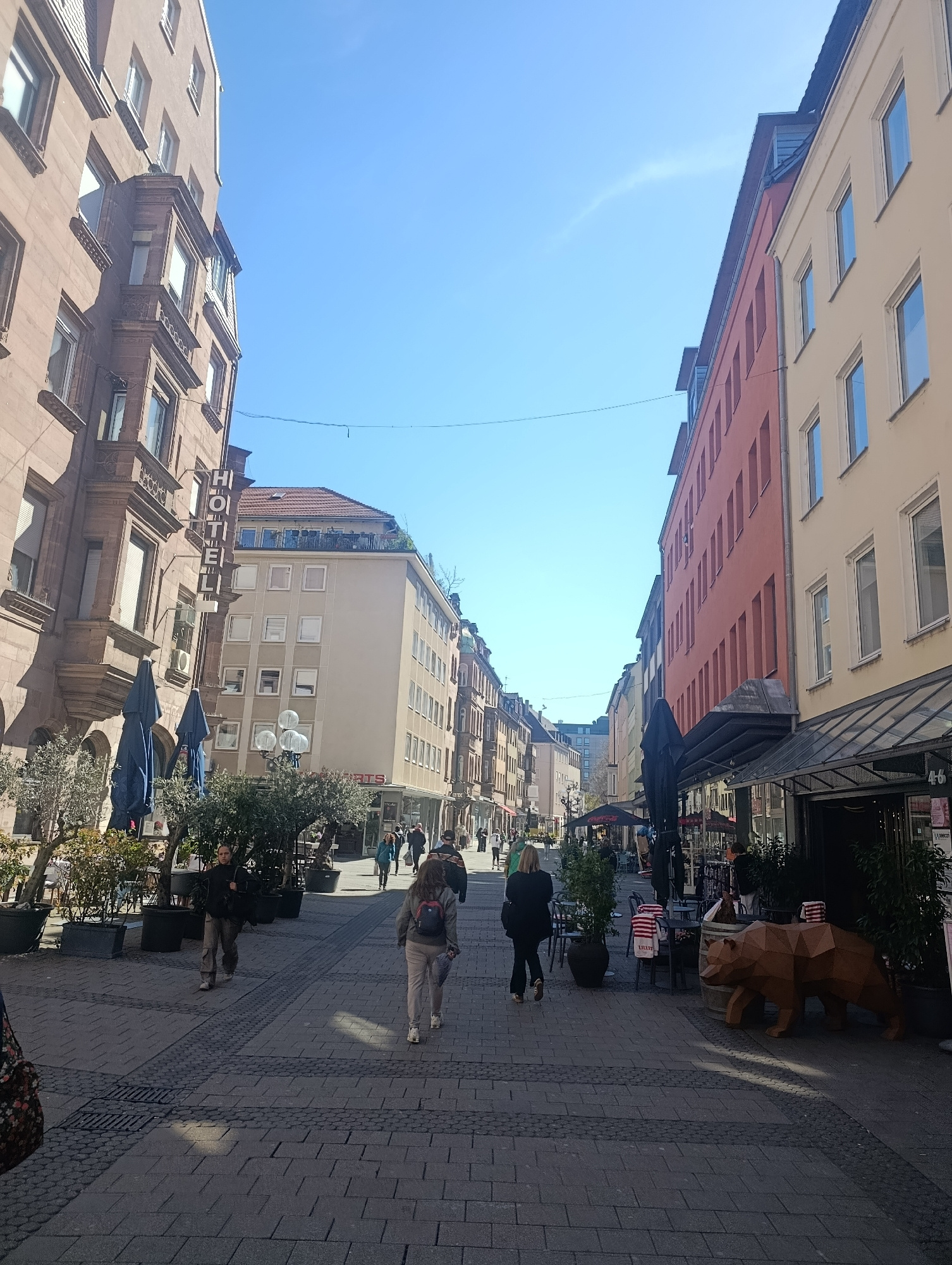 The image depicts a pedestrianized street in Nuremberg, Germany. The street is paved with interlocking grey blocks. Buildings of varying heights line both sides of the street. The building on the left…read more