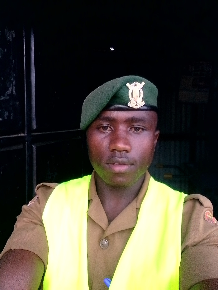 A man in a tan uniform and a green beret with a badge stands facing the camera. He wears a bright yellow safety vest. The background is a dark doorway or entrance. The man's skin tone is dark, and he…read more