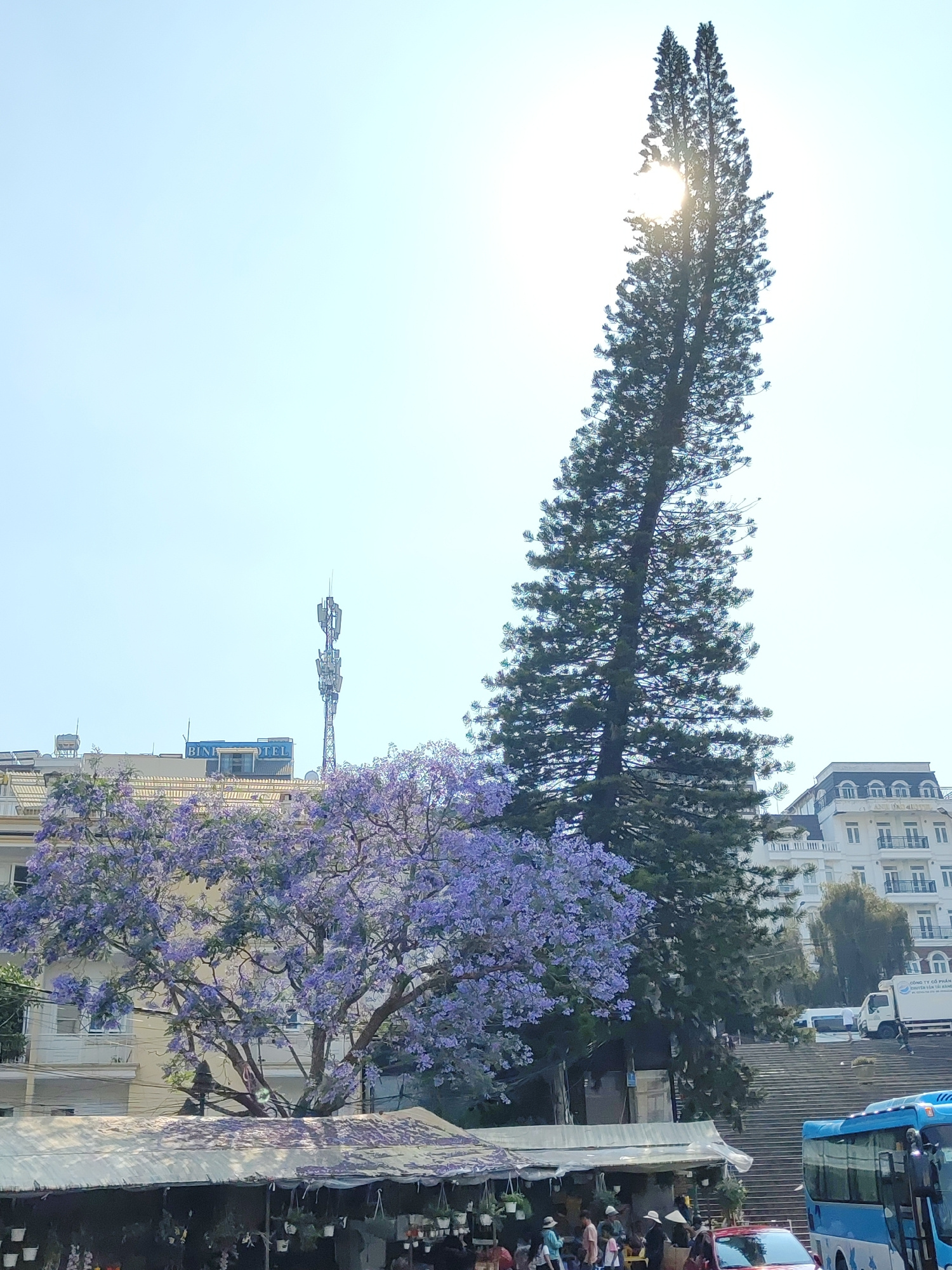 The image depicts an outdoor urban scene in Da Lat, Vietnam, under a bright, clear blue sky with the sun visible through the upper canopy of a tall, slender pine tree. In the foreground, a market stal…read more
