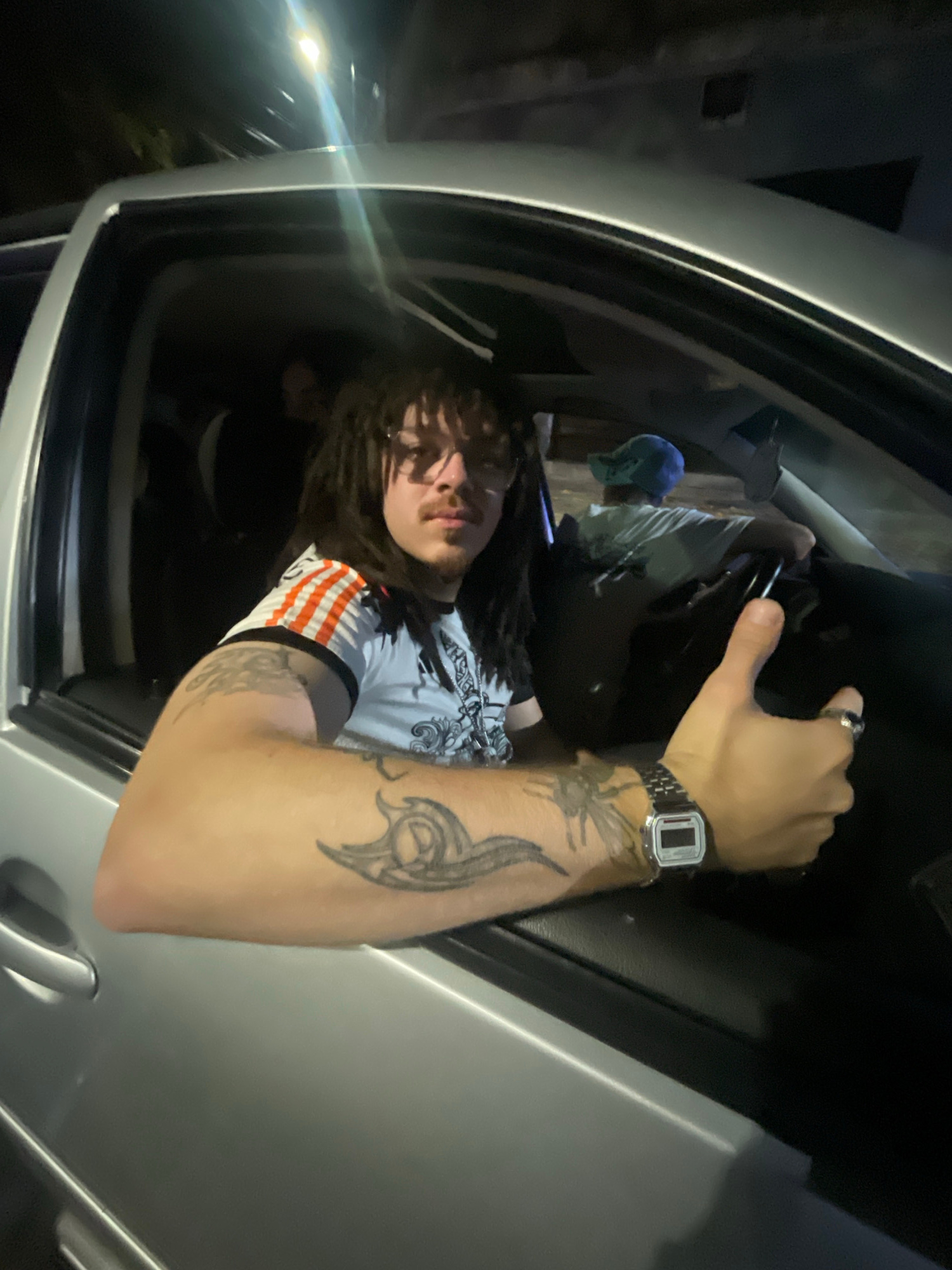 A person with dreadlocks is leaning out of a silver car, wearing a t-shirt with orange and white stripes on the sleeves. Their arm is extended, displaying a silver watch and a tattoo. The scene is dar…read more