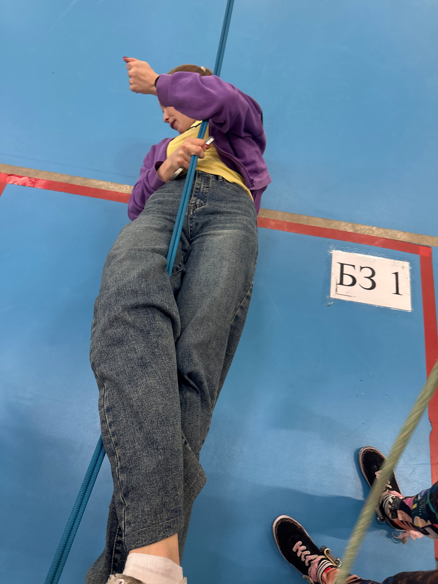 The image depicts a person in jeans and a purple jacket lying on a blue surface with red and white markings. The surface appears to be the floor of an indoor space. The person is holding onto a blue r…read more
