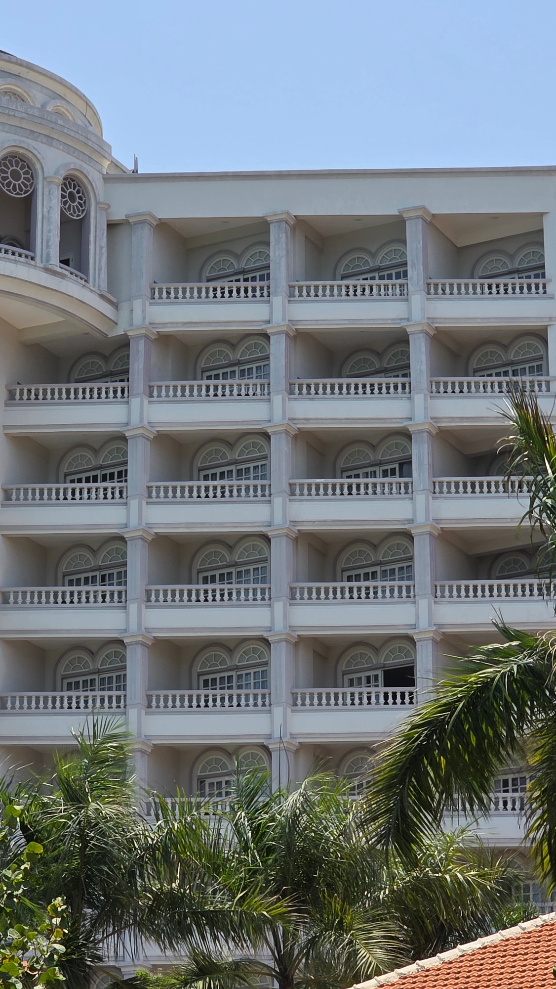 A tall, light-colored building with multiple rows of balconies is partially obscured by palm trees. The balconies feature arched windows or openings and detailed balustrades. The structure exhibits cl…read more