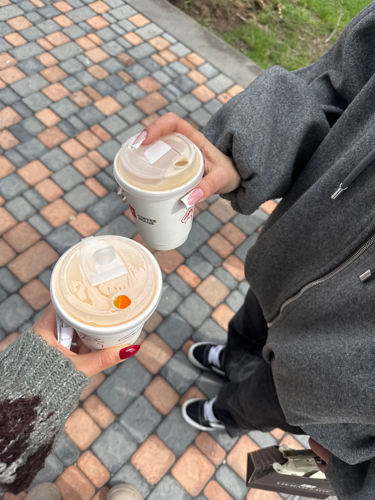 Two individuals stand on a pedestrian walkway constructed with alternating gray and orange-toned brick pavers. One person, wearing a gray zip-up hoodie and black pants with black and white sneakers, h…read more