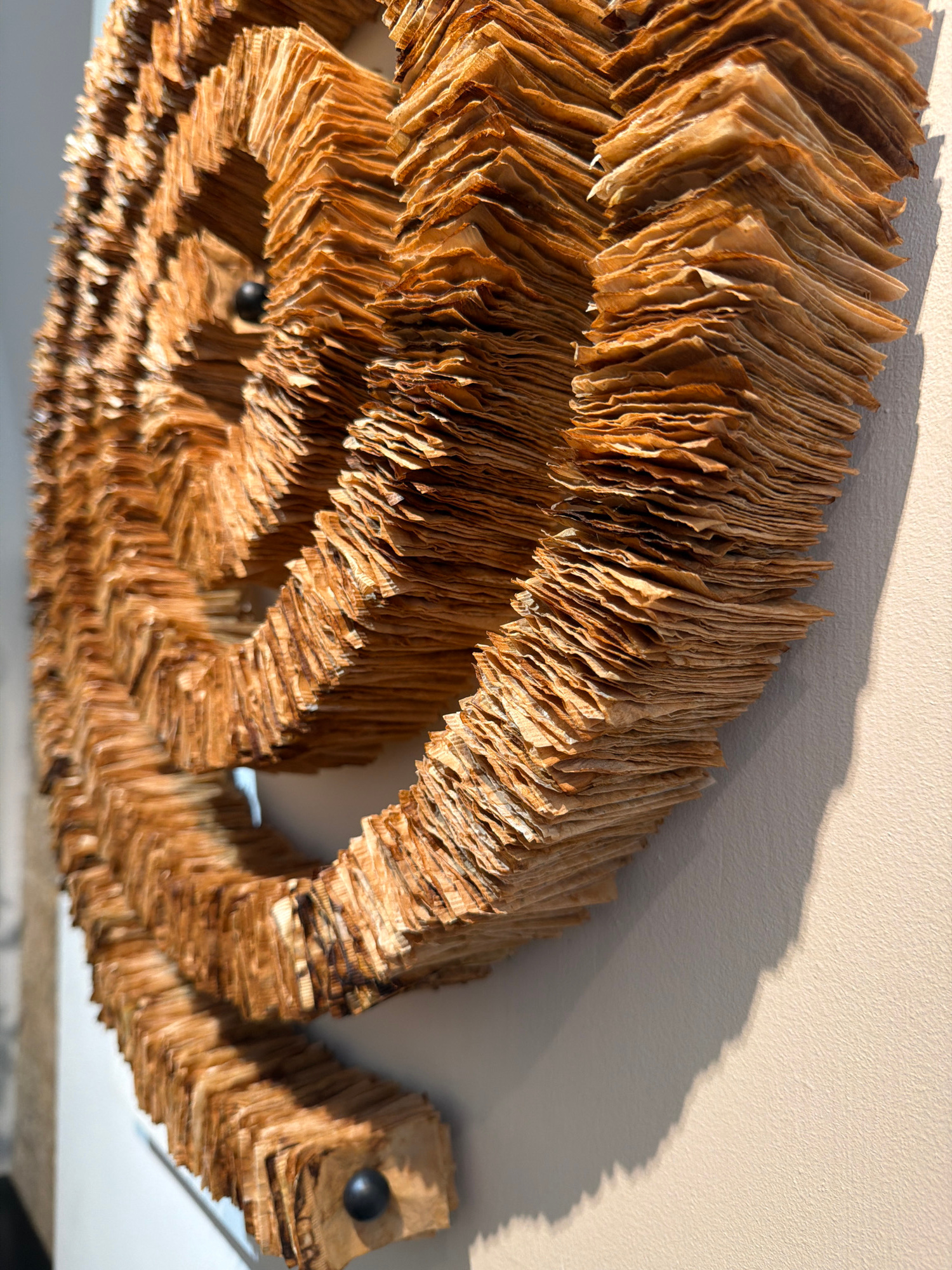 The image displays a close-up view of a three-dimensional artwork, likely a sculpture or wall installation, crafted from numerous thin, papery or fabric-like strips. These strips are predominantly in…read more