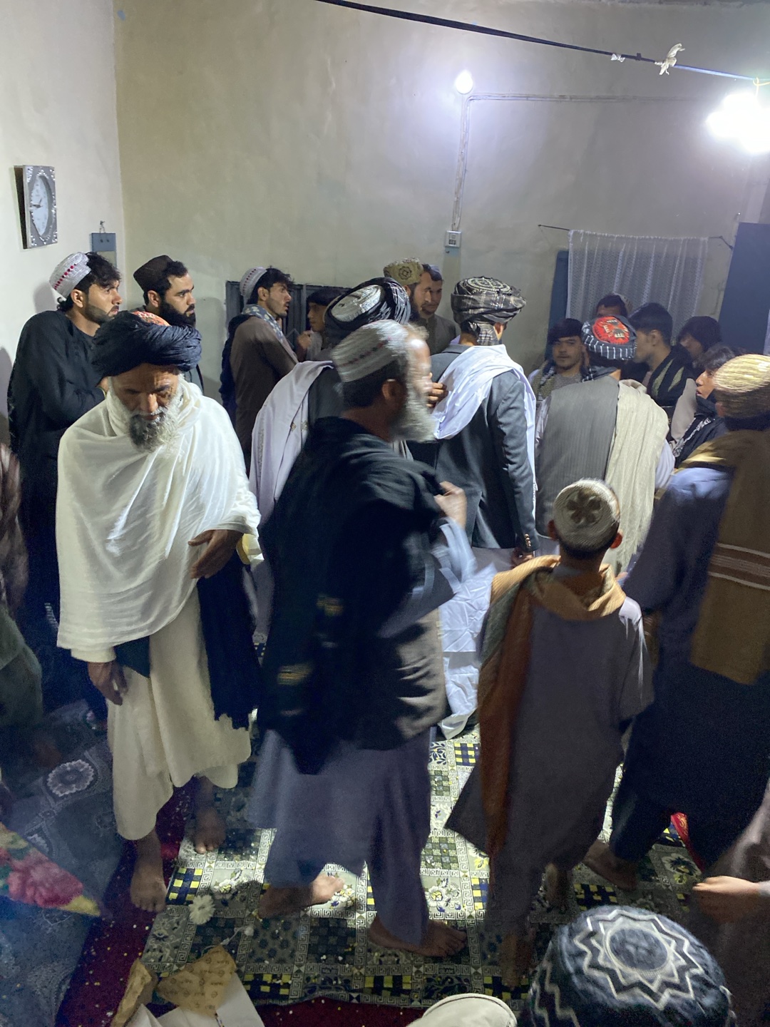 A gathering of barefoot men and a boy in a room, presumably in Kandahar, Afghanistan. The individuals are dressed in various traditional Afghan garments, including turbans and shawls. They stand on a…read more
