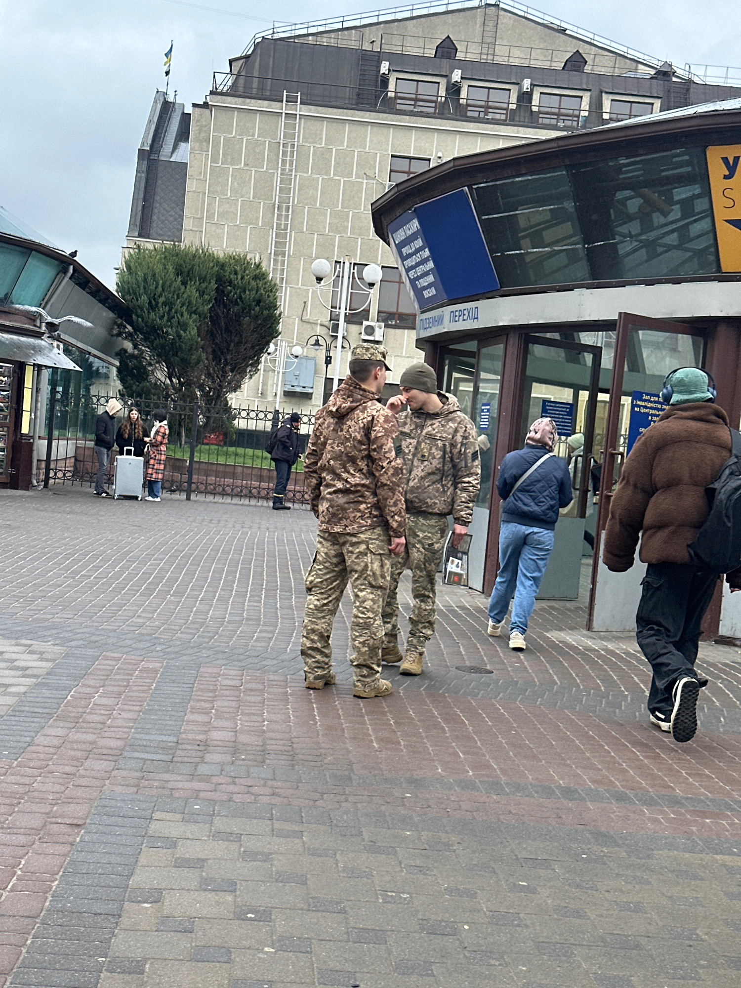 The image depicts a street scene in Kyiv, Ukraine. Two soldiers in camouflage uniforms stand on a brick sidewalk, appearing to be in close conversation. Behind them are pedestrians passing by, includi…read more
