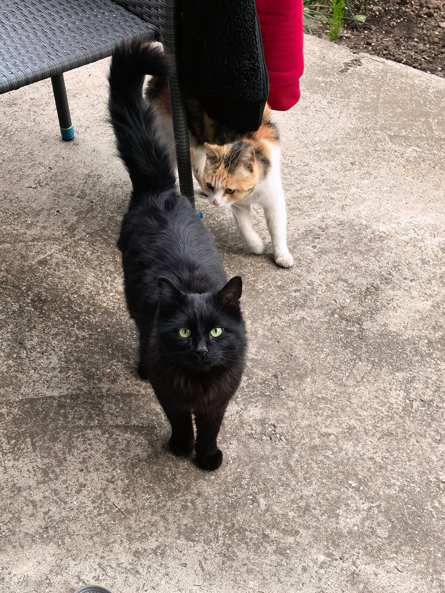 A high-angle, medium shot captures two cats standing on a concrete patio in an outdoor setting. The foreground features a sleek, black cat with piercing green eyes looking directly at the camera. Its…read more