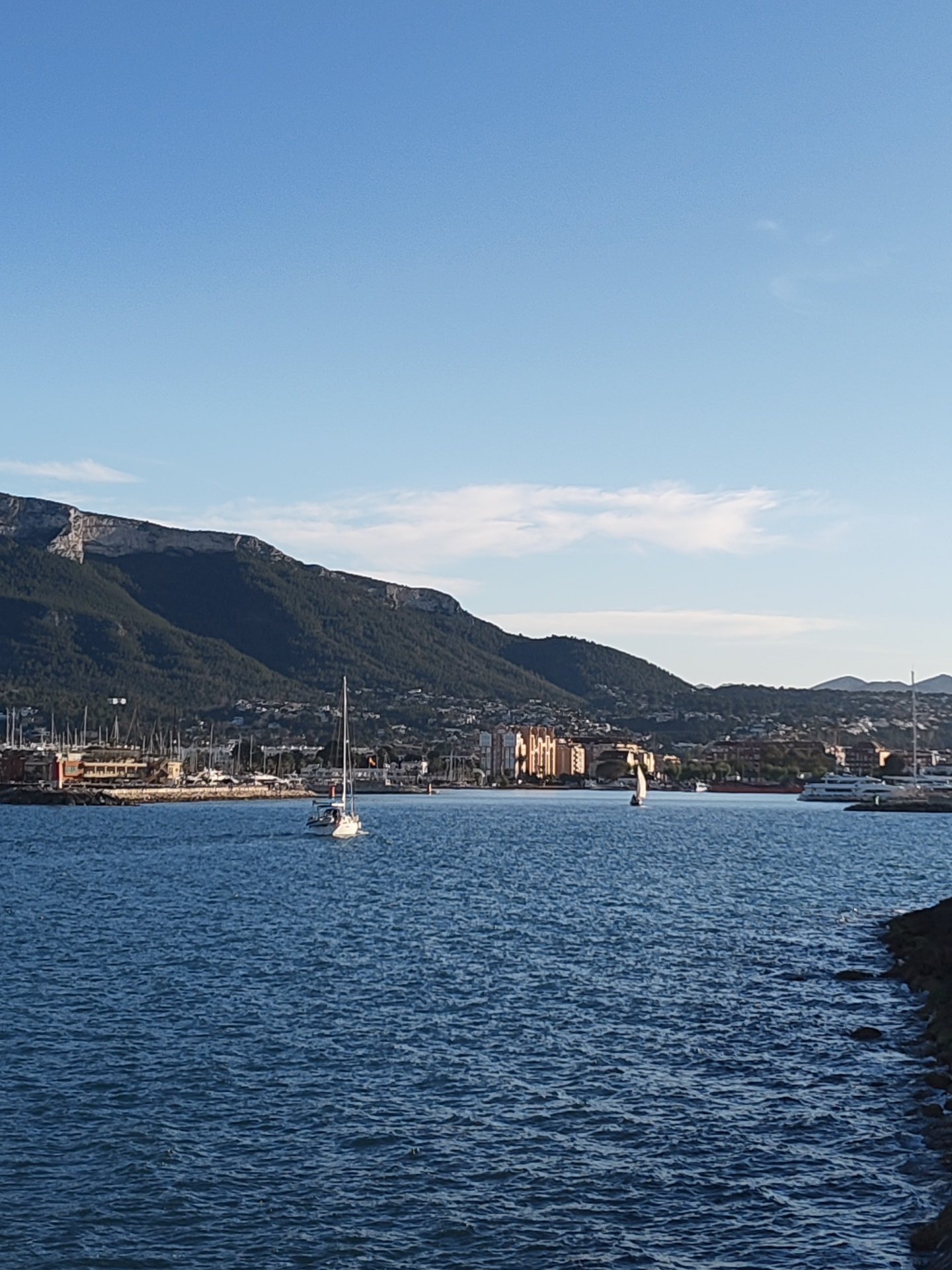 The image depicts a coastal scene in Dénia, Spain. In the foreground is the deep blue sea, with small waves visible. The right edge of the frame shows a rocky shoreline. In the middle ground, a sailbo…read more