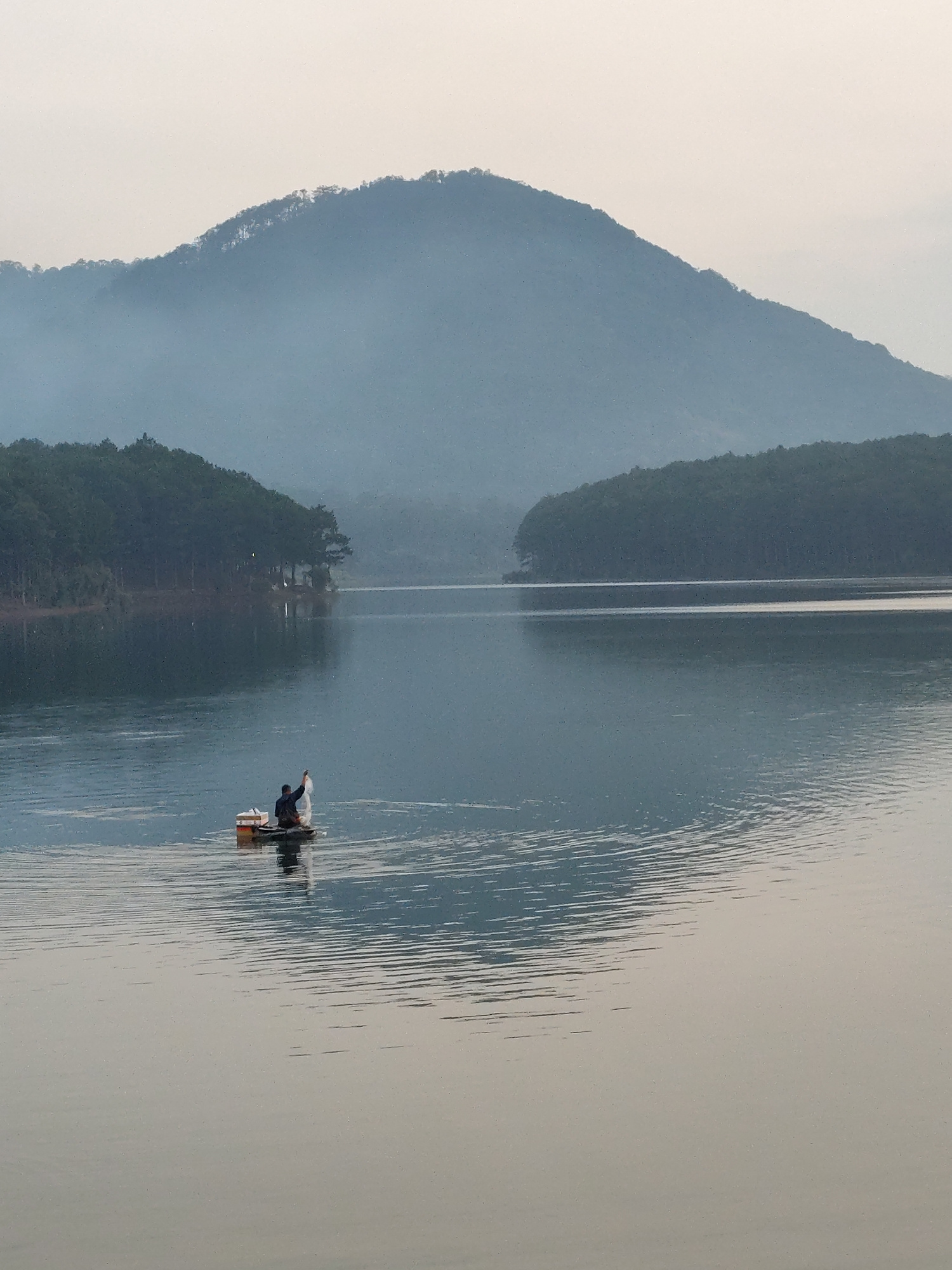 The image depicts a tranquil lake scene in Da Lat, Vietnam. A lone fisherman is visible in the center, standing on a small raft, holding what appears to be a fishing net above the water. The calm wate…read more