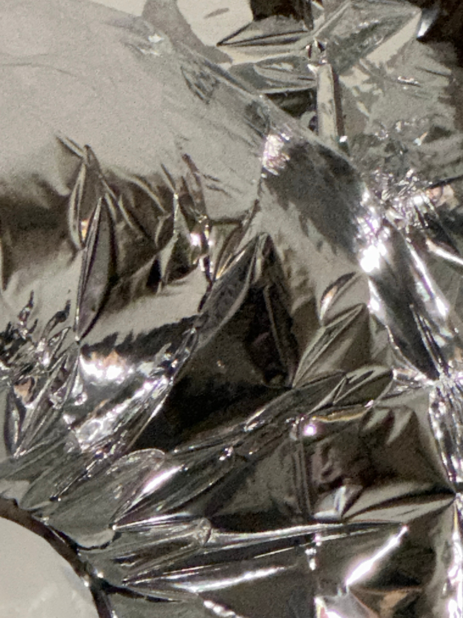The image presents a close-up, abstract view of a heavily crumpled, highly reflective silver-colored material, consistent with metallic foil or metallized plastic sheeting. The surface is characterize…read more