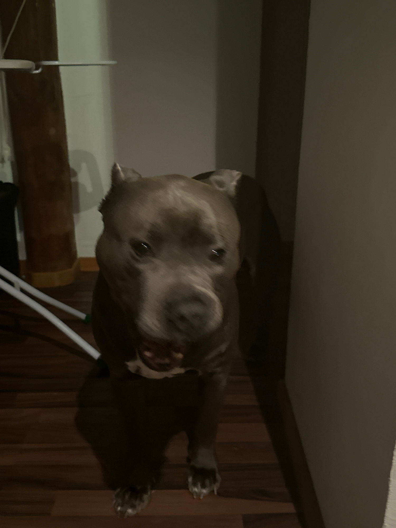 A gray-coated pit bull-type dog stands on a wooden floor, looking up at the camera. The dog is indoors, likely in a home. A white folding chair is partially visible near the dog. A piece of furniture…read more