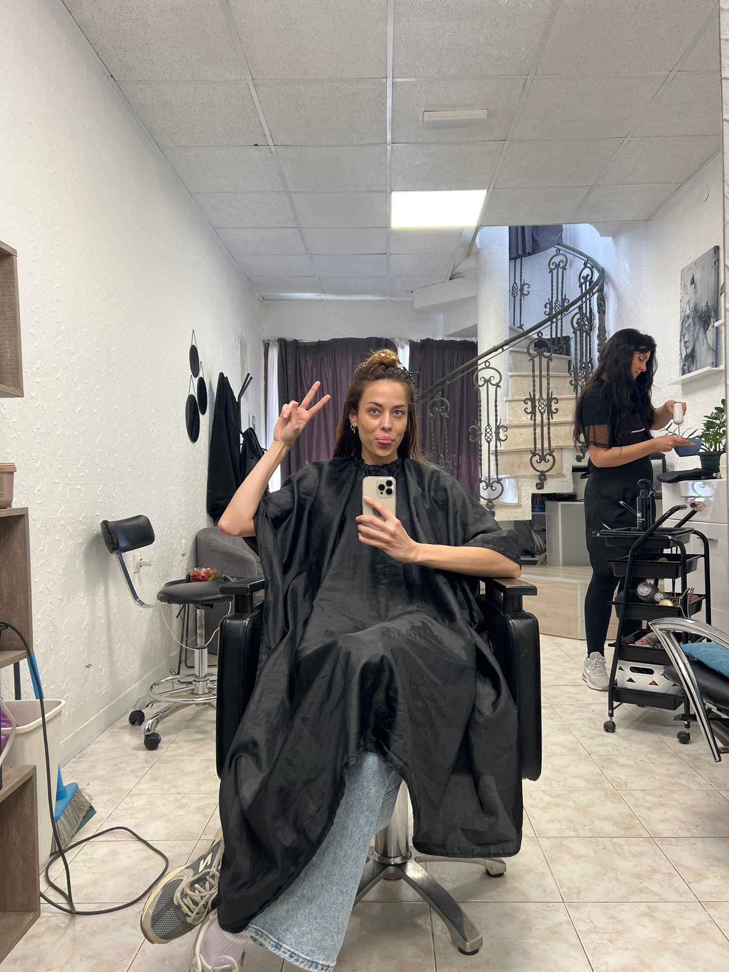 The image shows a woman sitting in a salon chair, covered in a black cape, holding a phone, and making a peace sign. Her jeans and sneakers are visible. A second woman, presumably a hairdresser, is st…read more