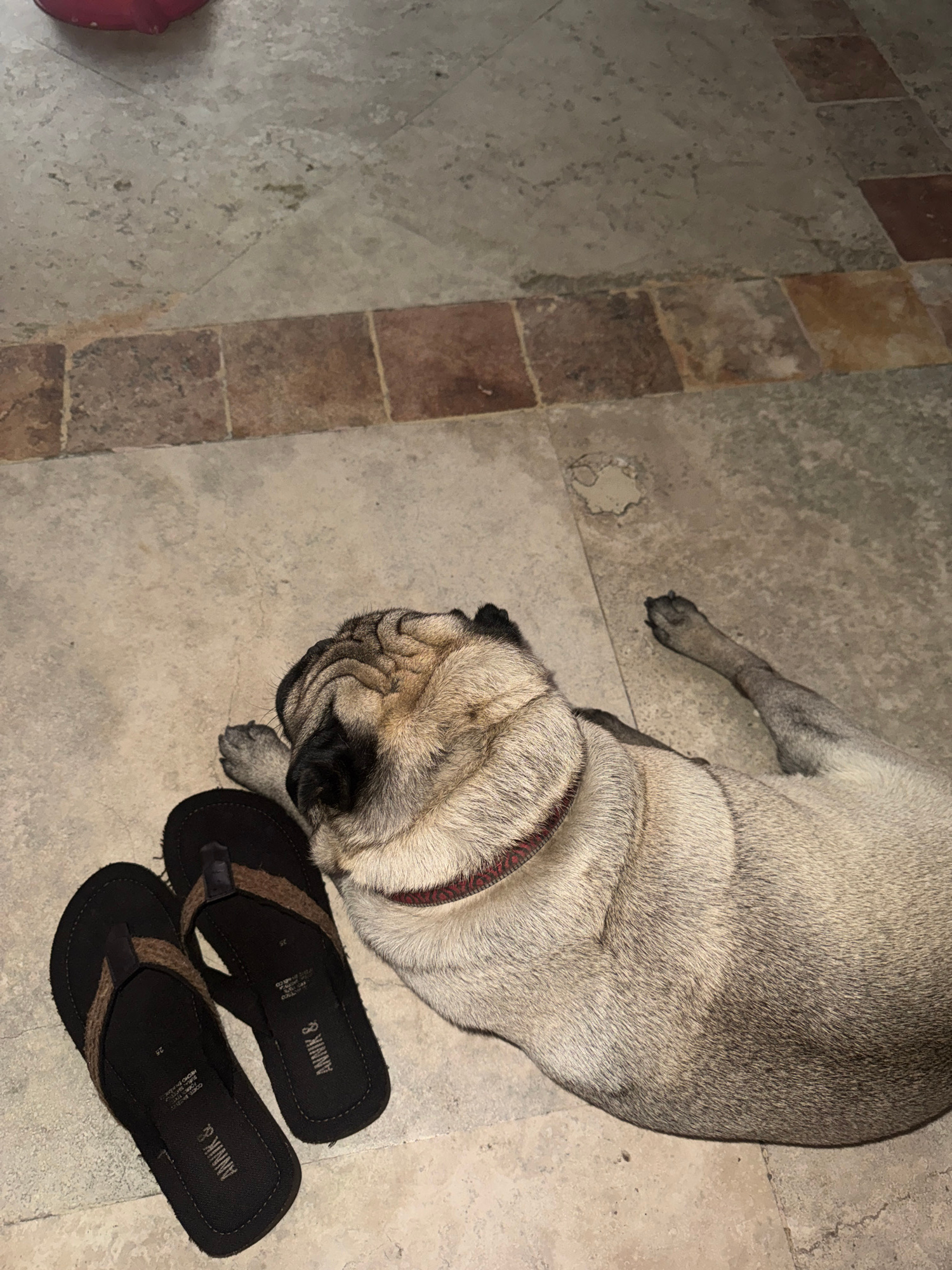 The image depicts a pug dog resting on a tiled floor. The dog, predominantly fawn-colored with a black muzzle and mask, is lying on its left side with its head down, appearing to sleep or rest. A dark…read more