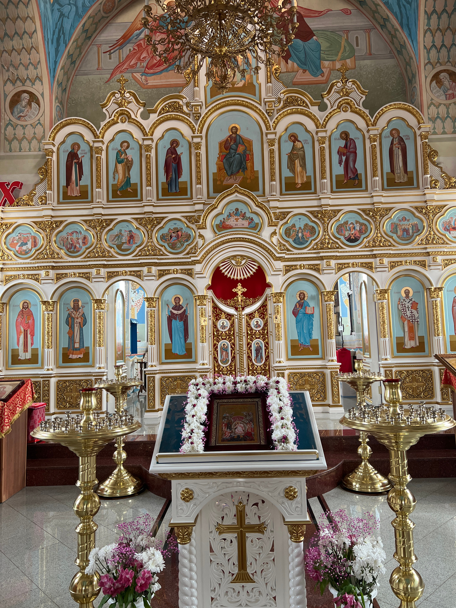 The image shows the interior of a church, presumably in Kargopolye, Russia, given the prompt's context. The scene features a highly ornate iconostasis, a wall of icons and religious paintings separati…read more