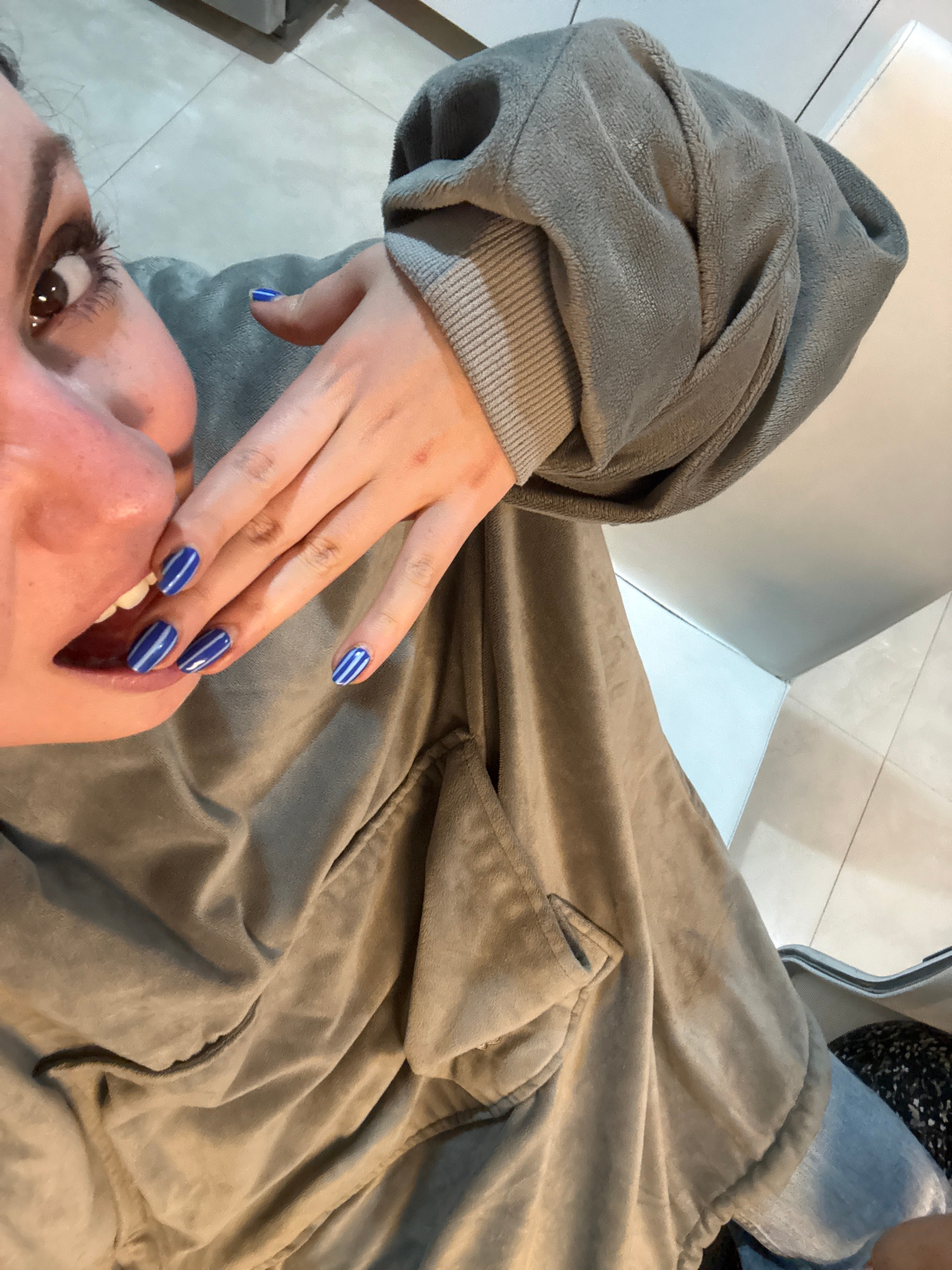 A close-up, high-angle shot shows a person wearing a grey, plush jacket, appearing to be indoors. The person's face is partially visible in the lower part of the frame. The person's hand rests on thei…read more