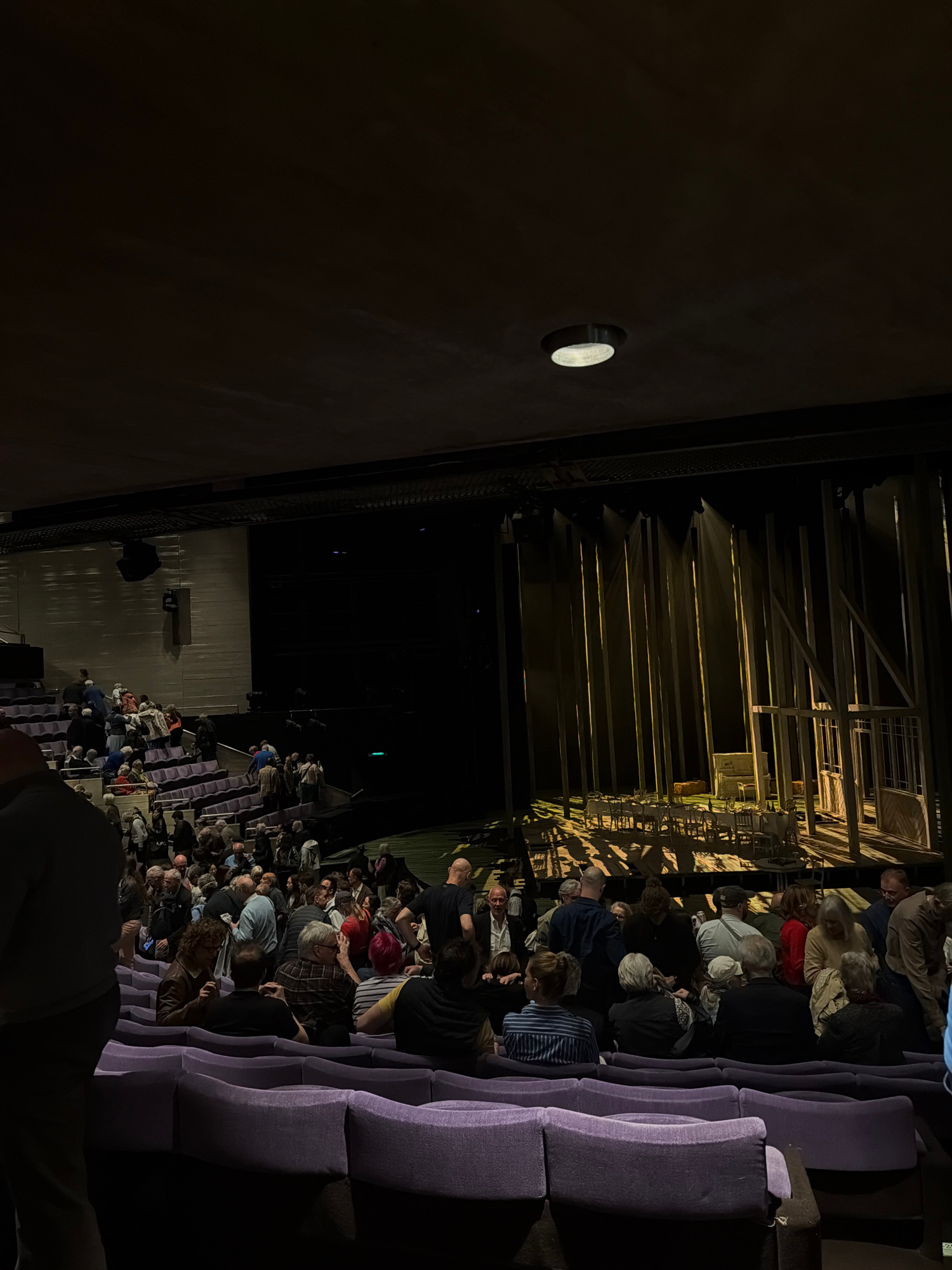 The image shows an audience seated in a theater. The rows of seats are upholstered in purple. On the stage, a set with wooden beams and structural elements is illuminated with light. The scene is indo…read more