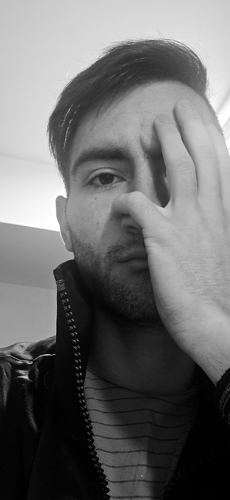 A black and white close-up photograph depicts a man. His right eye is visible. His right hand is covering the lower part of his face. He has short dark hair and a beard. He is wearing a striped shirt…read more