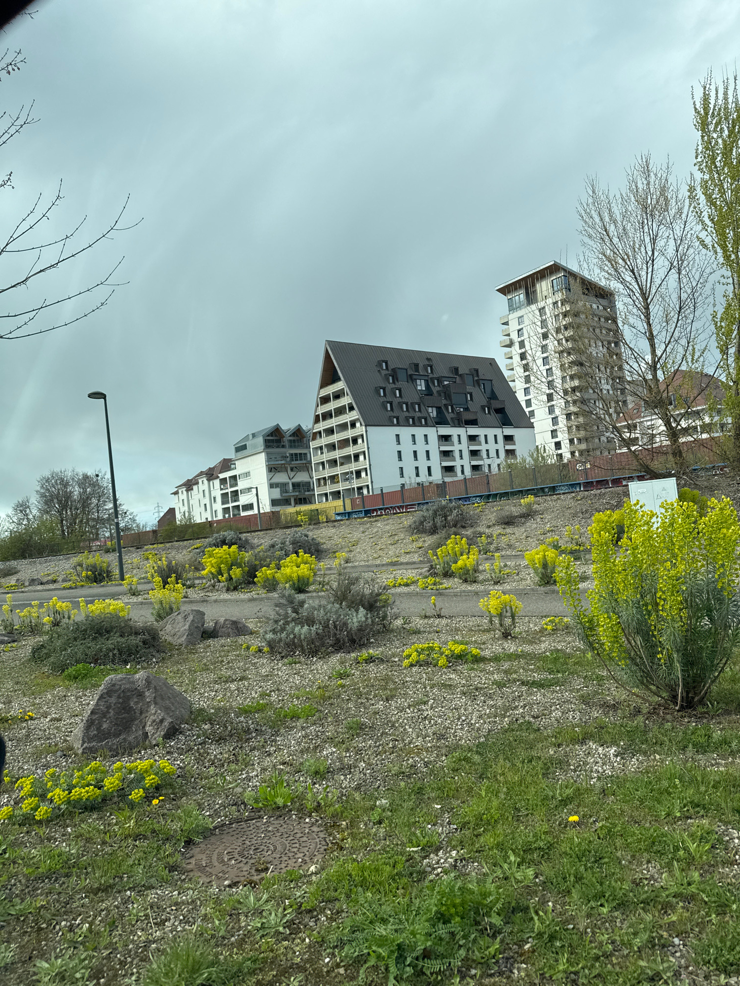 The image shows a view of the Citadelle district in Strasbourg, France, under a cloudy sky. Several modern apartment buildings are visible in the background. In the foreground, there's a strip of land…read more