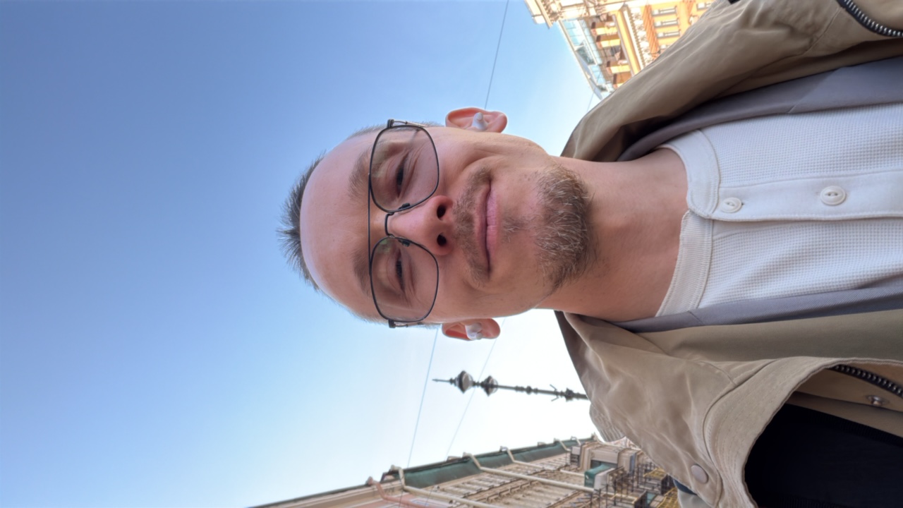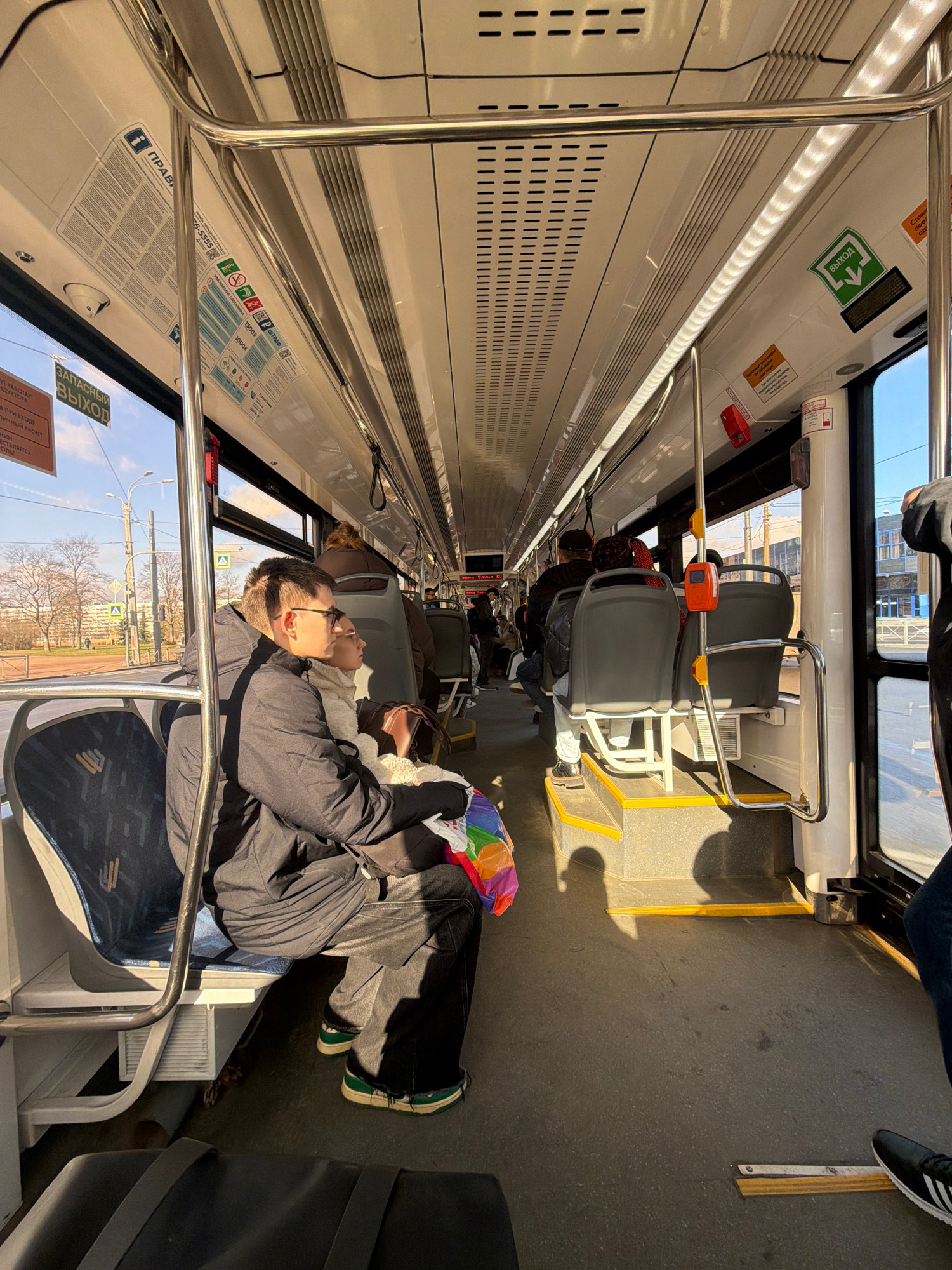 Here's a detailed description of the image: **Setting:** The interior of a public transportation vehicle, likely a bus or tram, in Saint Petersburg, Russia, based on the visible Cyrillic text and arc…read more