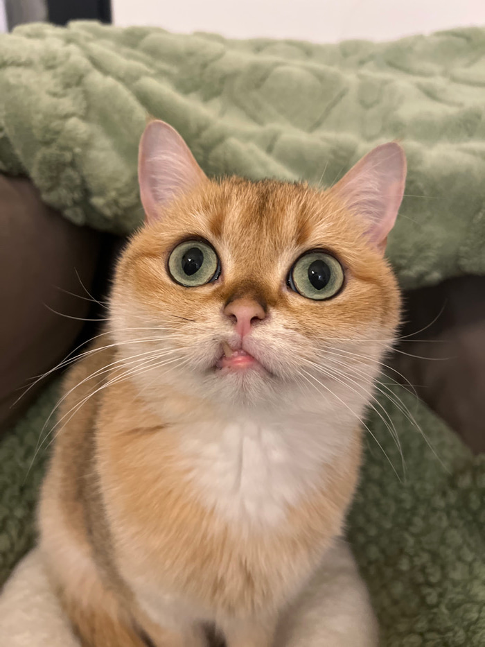 A close-up, high-angle shot captures the face of a cat with striking features. The cat, appearing to be a Golden Shorthair or similar breed, has predominantly golden-orange fur with lighter, almost wh…read more