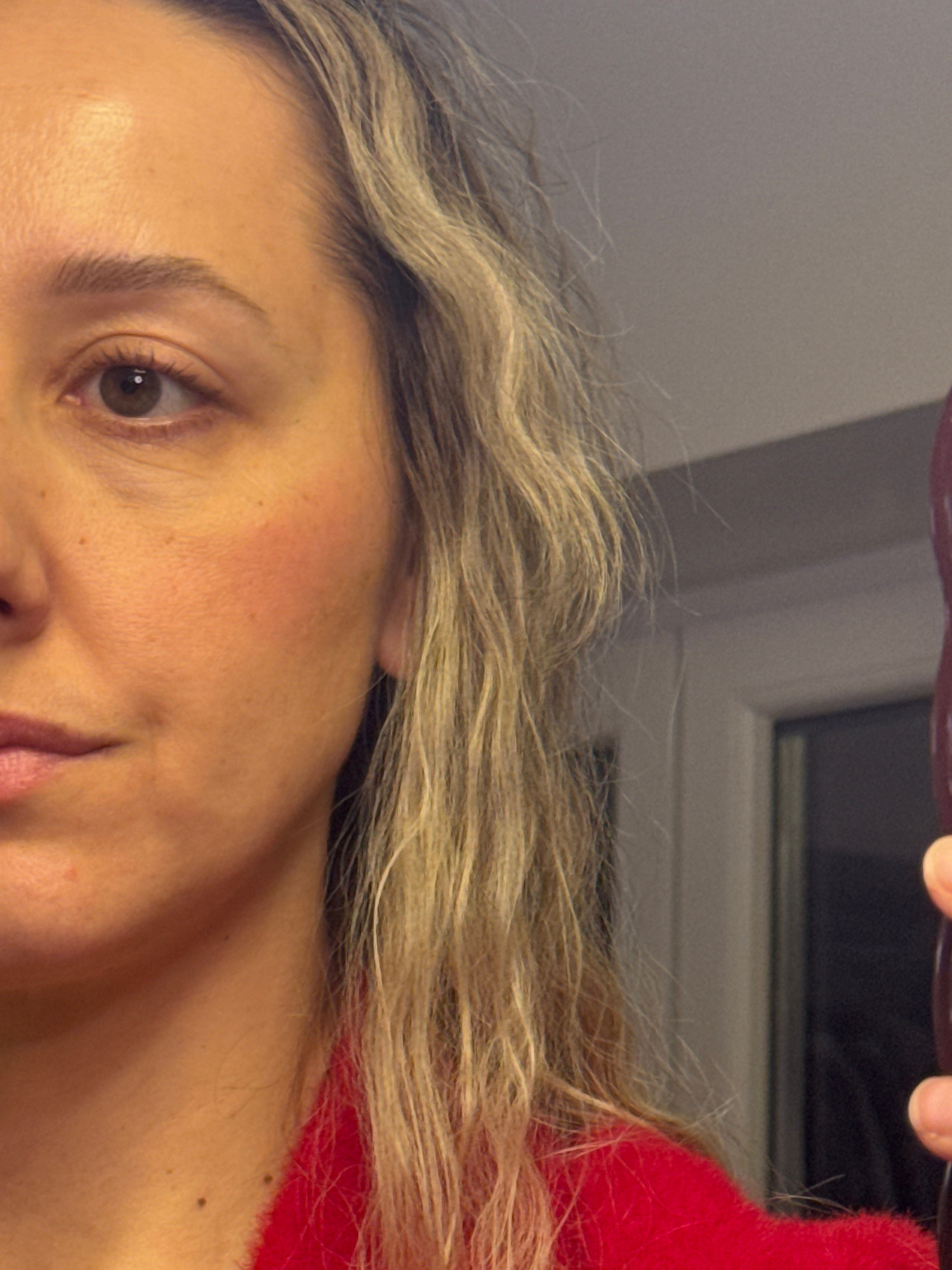 A blonde woman with fair skin is seen from a low, angled perspective, with part of her face visible, including an eye, cheek, nose, and lips. She is wearing a red sweater. Above her head are her blond…read more