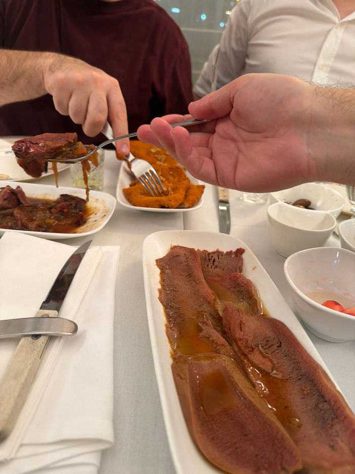 A table is set with various plates of food. There is a plate of what appears to be sliced beef tongue in gravy, a plate of fried food, and another plate with meat in a brown sauce. A person is using a…read more