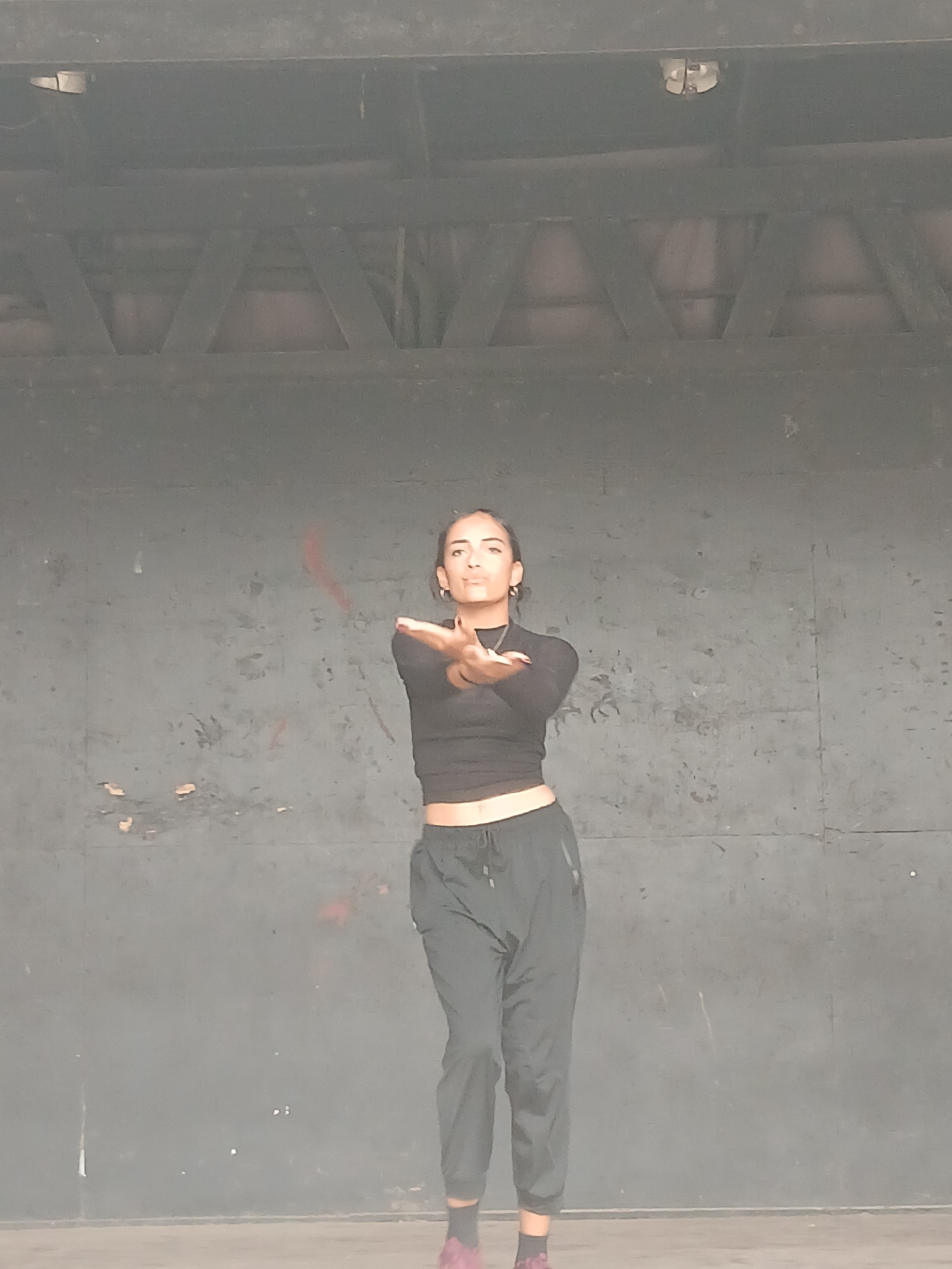 A medium shot depicts a person lying diagonally across a dull gray surface that appears to be a stage or floor. The person, facing the camera, is wearing a black long-sleeved shirt and dark pants. The…read more