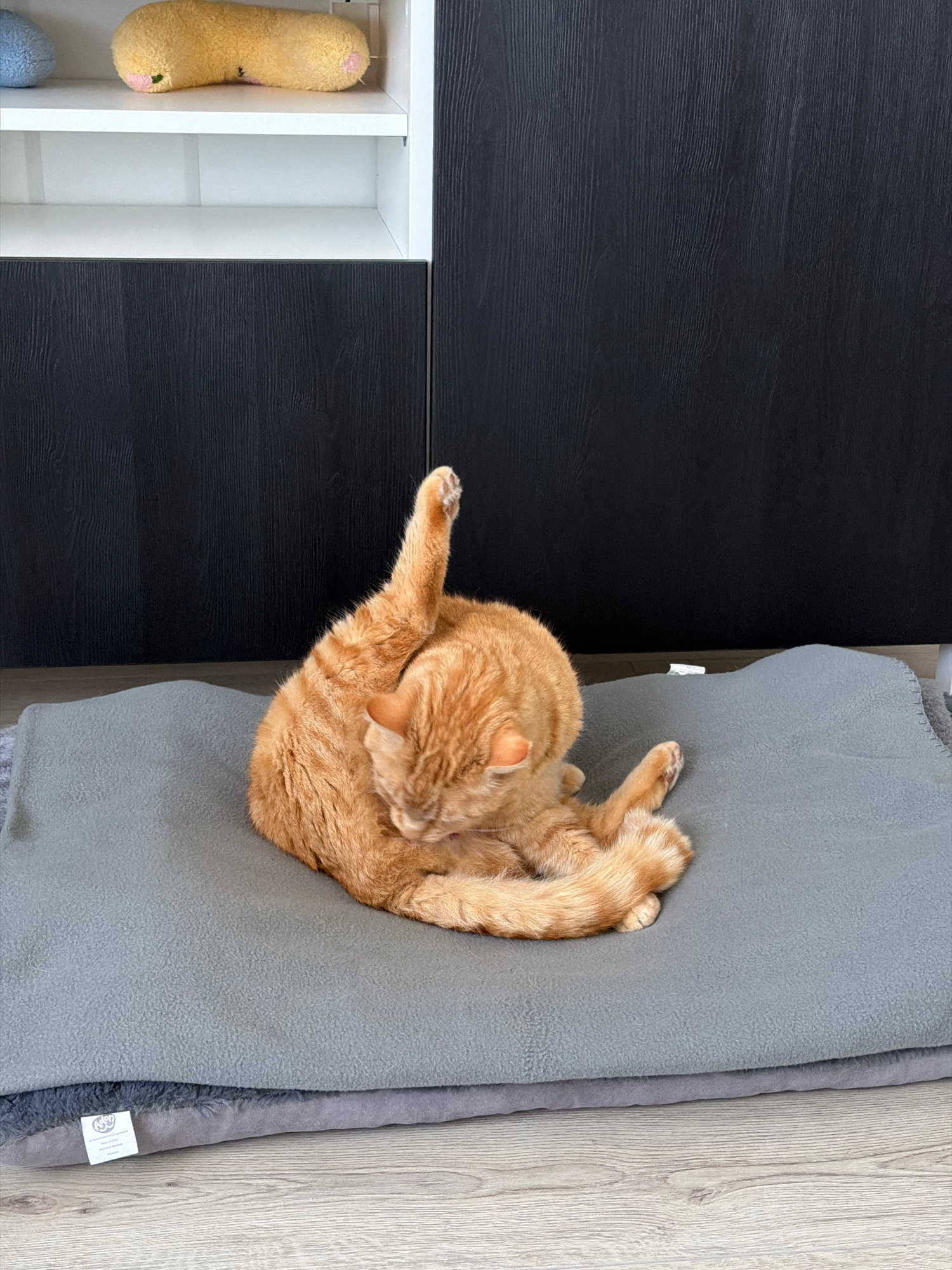 An aerial shot shows an orange tabby cat grooming itself on a grey pet bed resting on a light wooden floor. The bed is next to a dark grey cabinet with a white drawer unit on its left, containing a ye…read more
