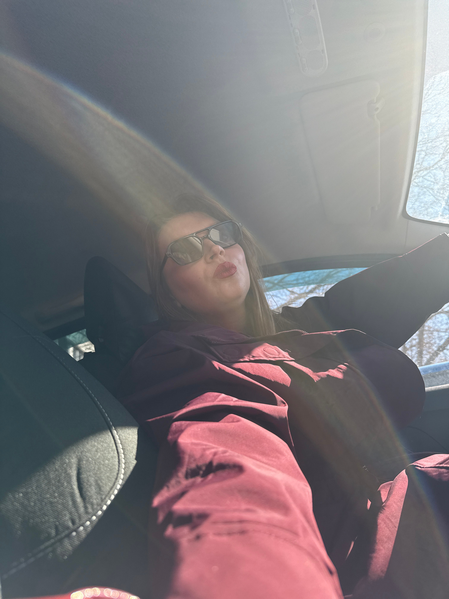The image captures a person reclining inside a car, viewed from a low, tilted angle. The primary subject is a person, likely female, with long brown hair, wearing dark sunglasses and a dark maroon or…read more