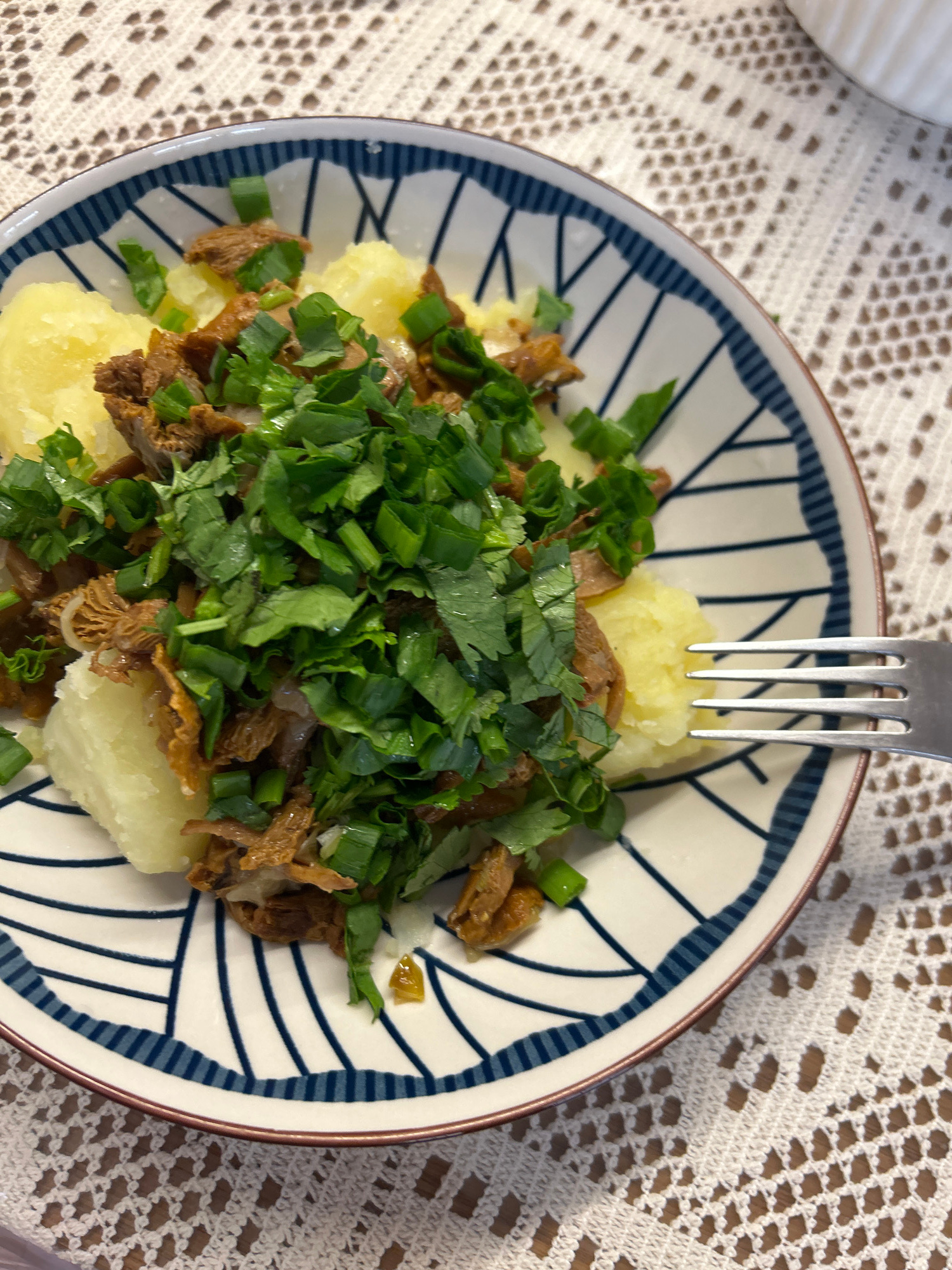 A top-down shot captures a blue and white patterned plate filled with what appears to be a homemade dish. The main components of the dish are boiled potatoes, shredded meat or mushrooms, cilantro, and…read more