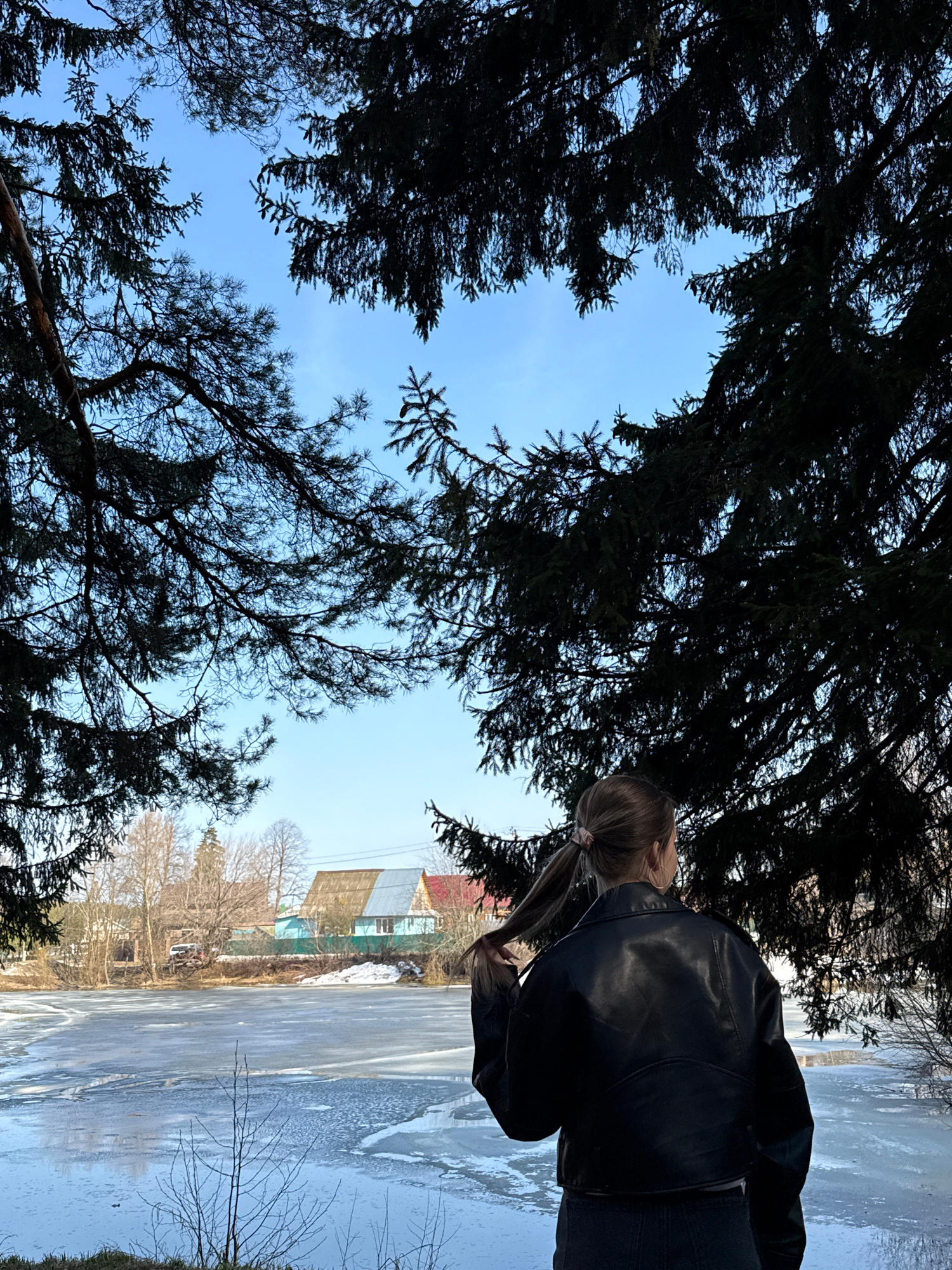 A woman with light brown hair pulled back into a low ponytail stands near a partially frozen body of water, possibly a river or lake. She is wearing a black leather jacket. The view is partially obscu…read more