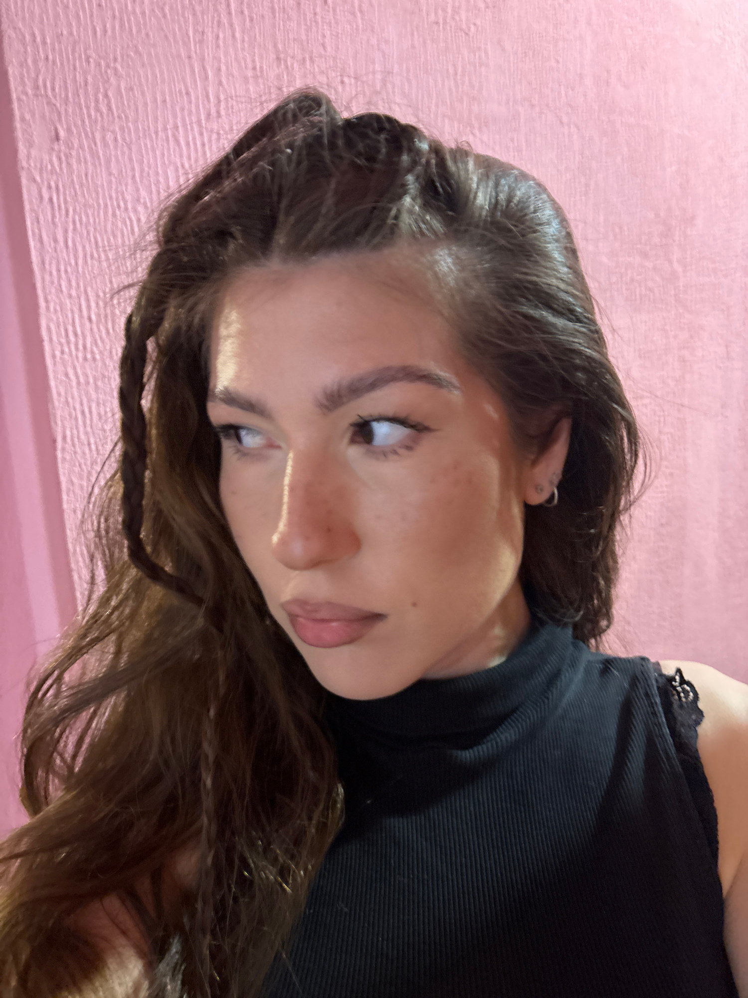 A close-up, angled portrait of a young woman with light skin, brown hair, and light eyes. She is wearing a black top with lace detailing at the shoulder. Her hair is styled with a braid visible on the…read more