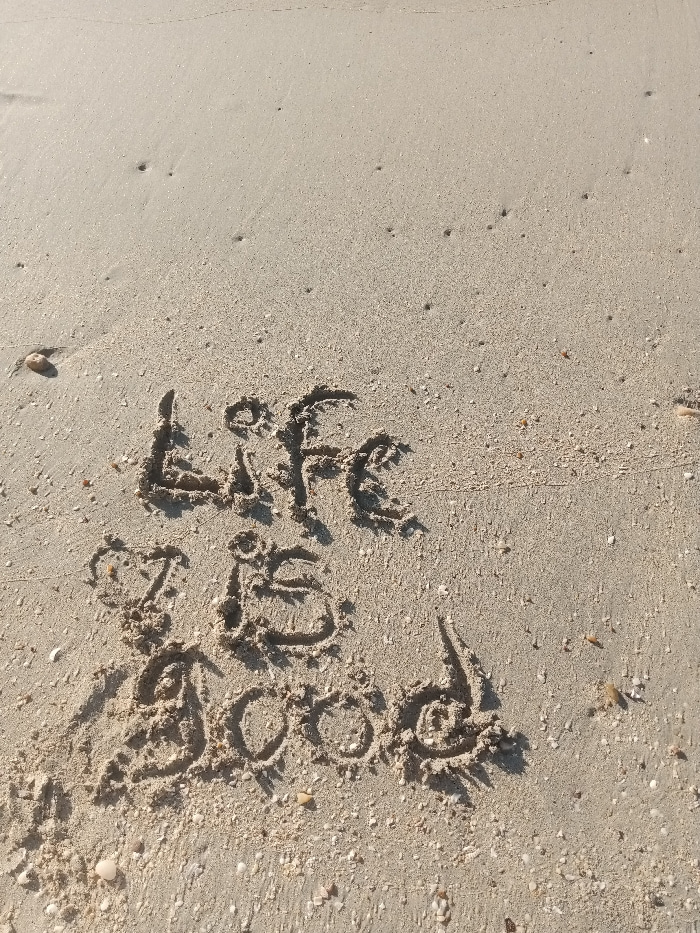 The phrase "Life is good" is written in the sand. The letters are formed by displacing the grains of sand, creating a darker contrast against the surrounding lighter sand. Small shells and pebbles areβ¦read more