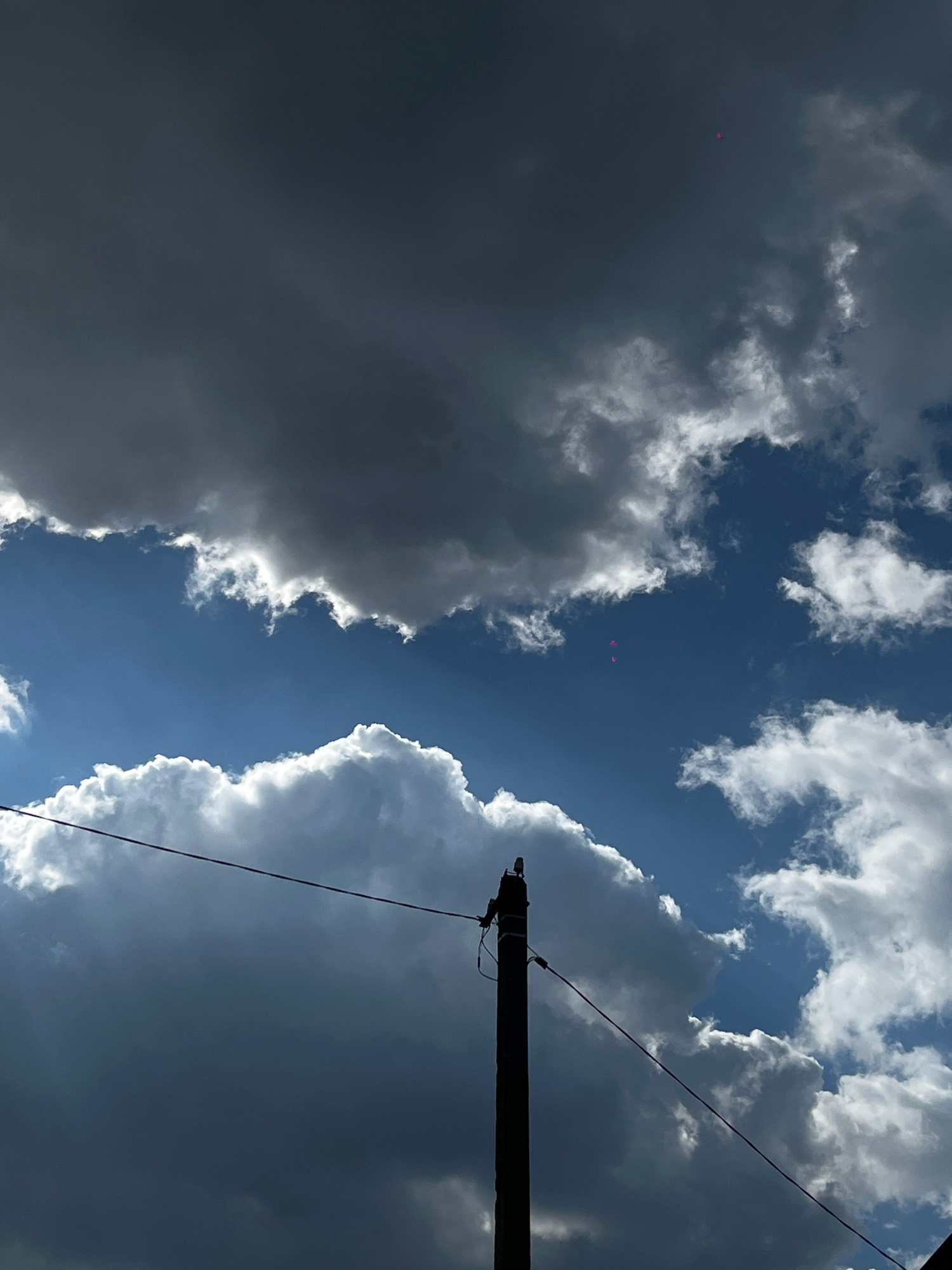 The image shows a view of the sky with clouds and a utility pole. The sky is partially clear blue, with both dark and white cumulonimbus clouds on either side. Two pink objects (possibly balloons or d…read more