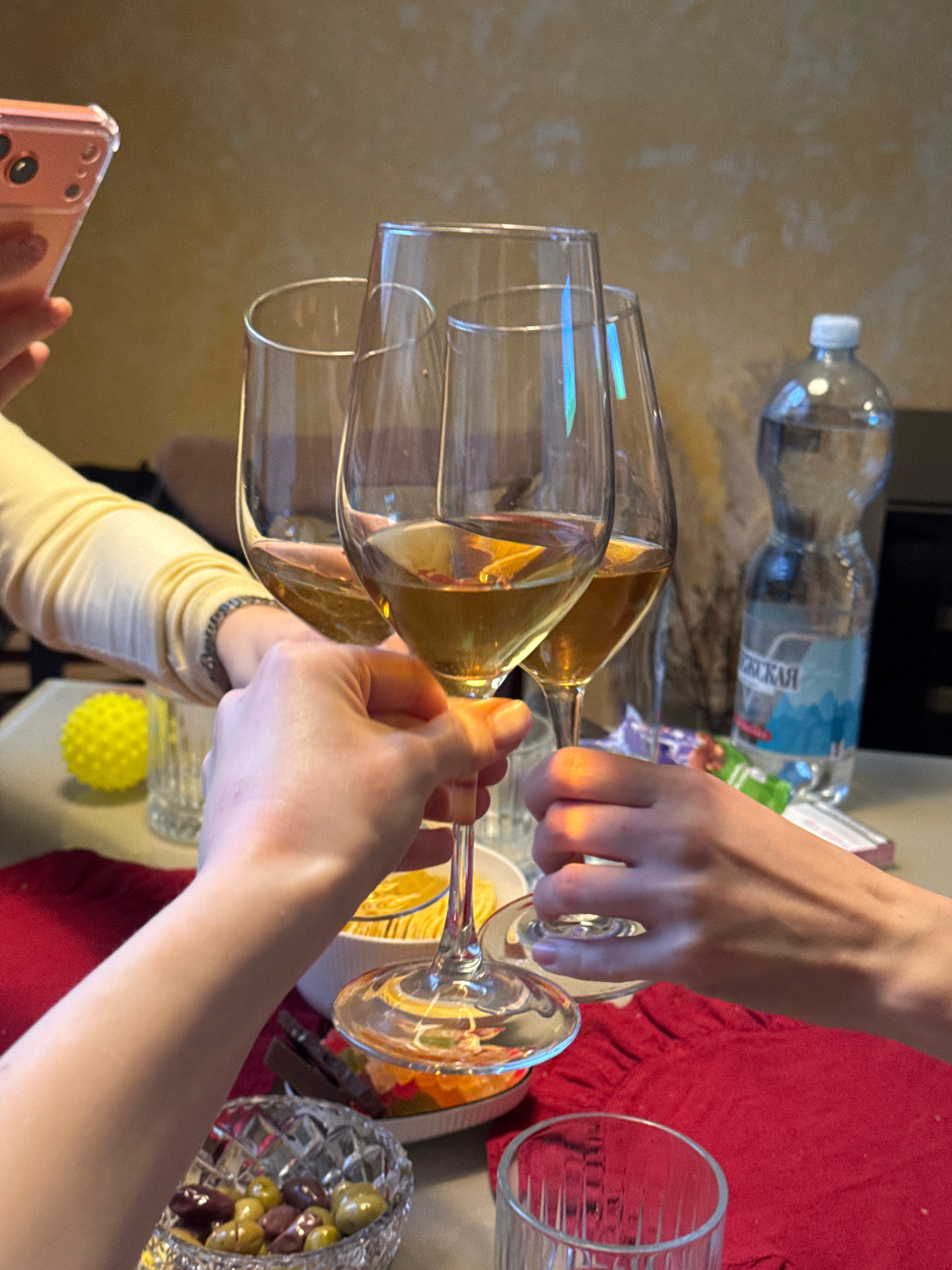A slightly rotated, close-up shot captures a celebratory event, possibly a toast, taking place indoors in an unspecified city. Two champagne flutes, filled with a golden liquid likely to be champagne…read more